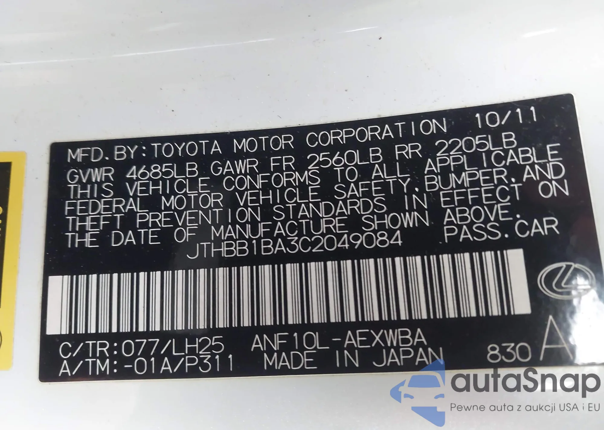 • VIN JTHBB1BA3C2049084