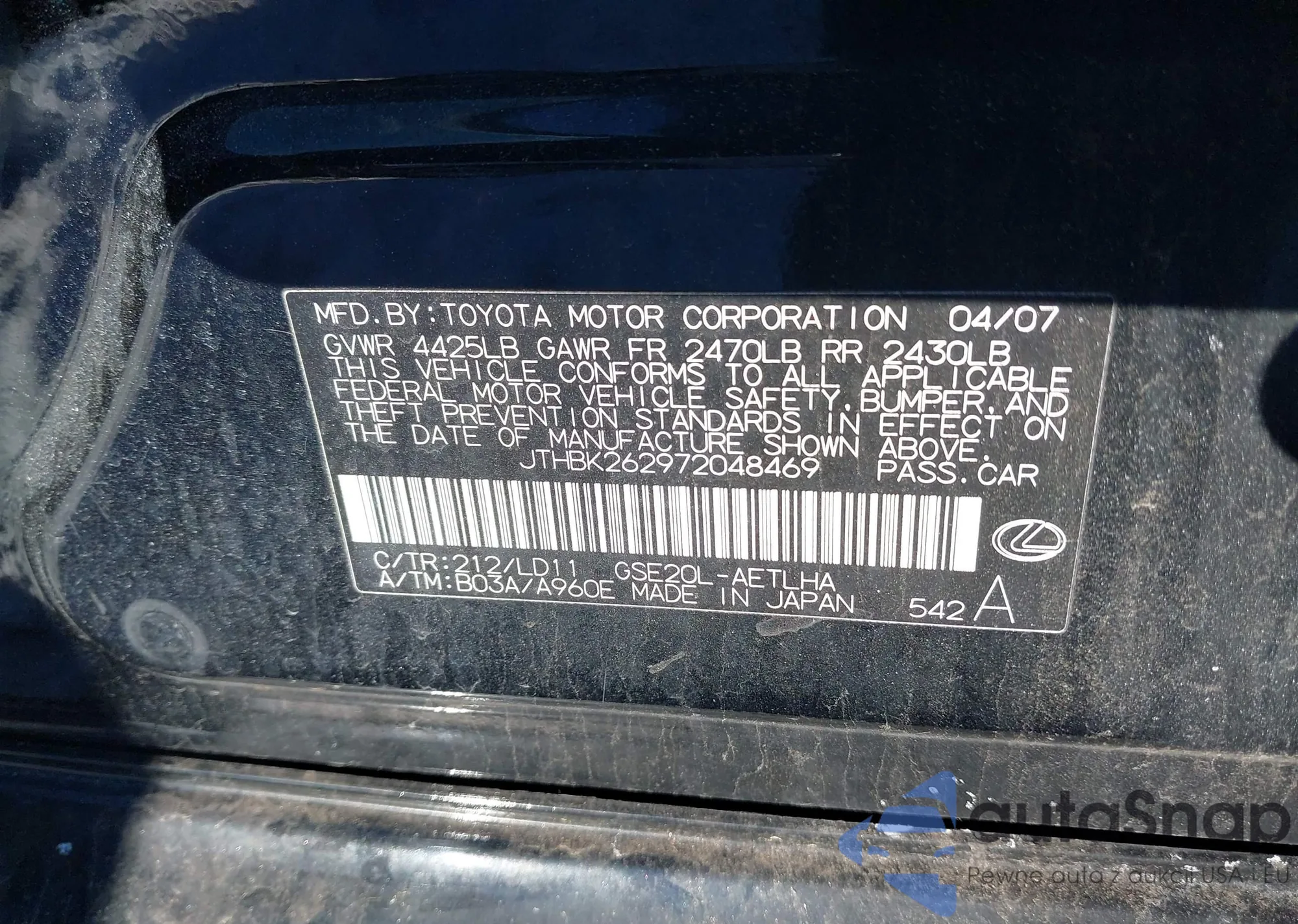 LOT: 44296132 VIN: JTHCK262072019480