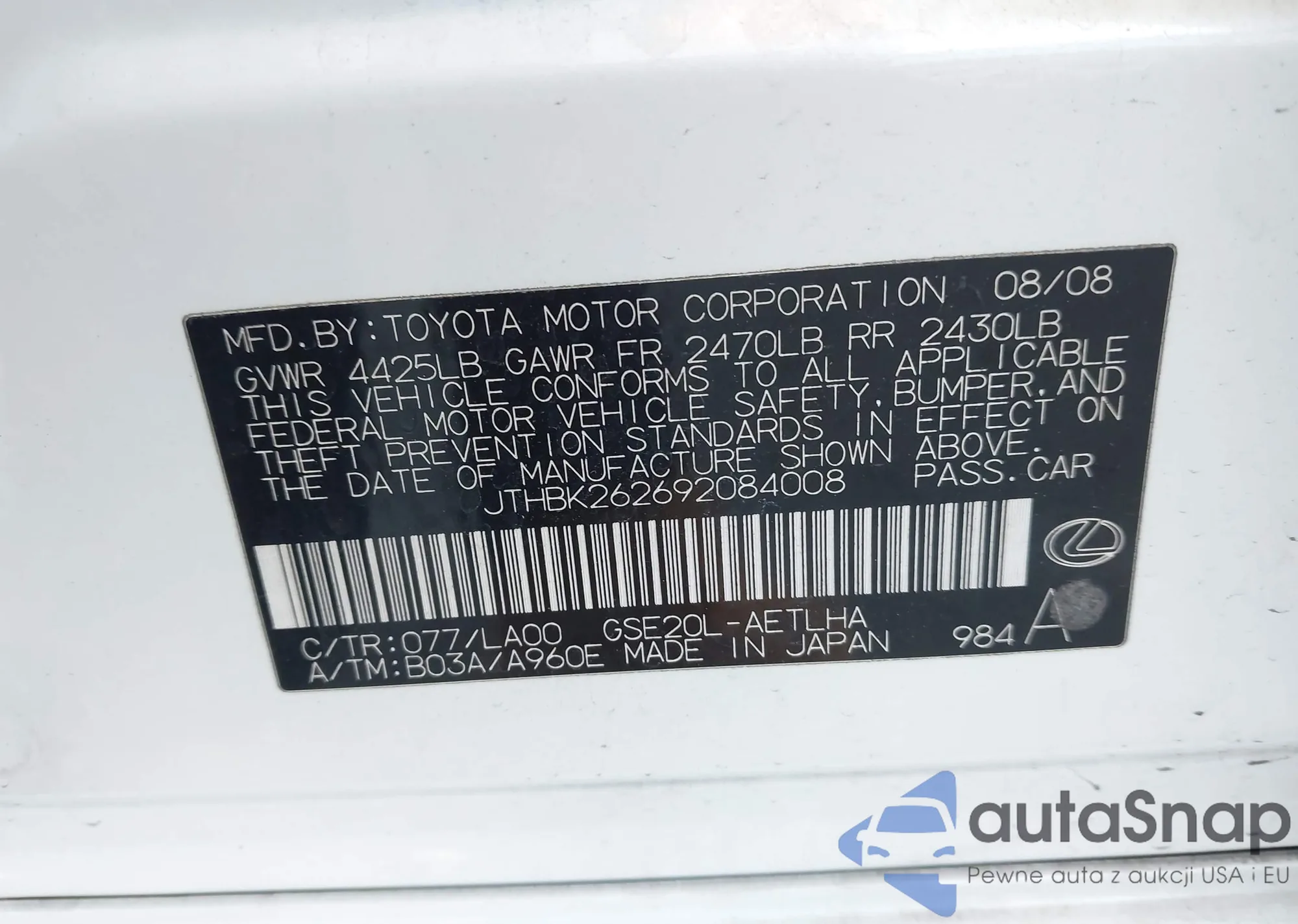 LOT: 44296562 VIN: JTHBK262185076427
