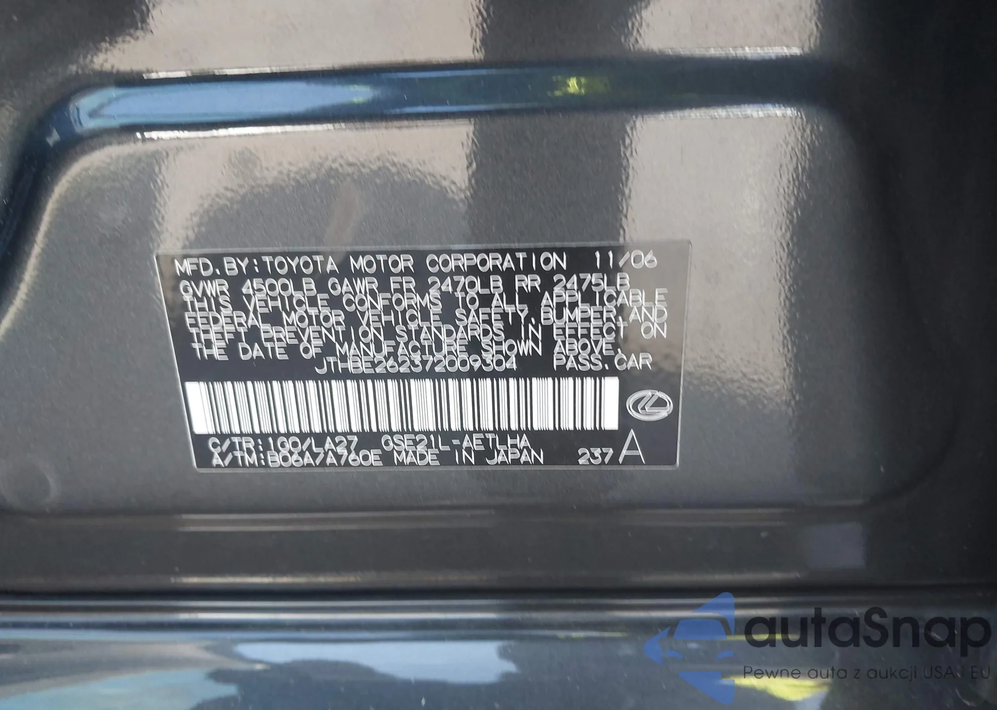LOT: 44283719 VIN: JTHBE262372009304