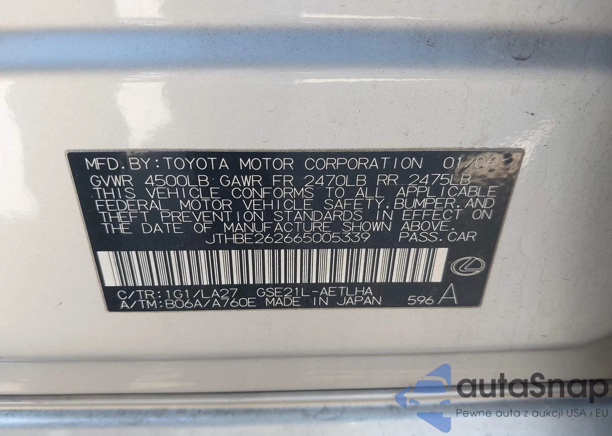 LOT: 44303746 VIN: JTHBE262665005339