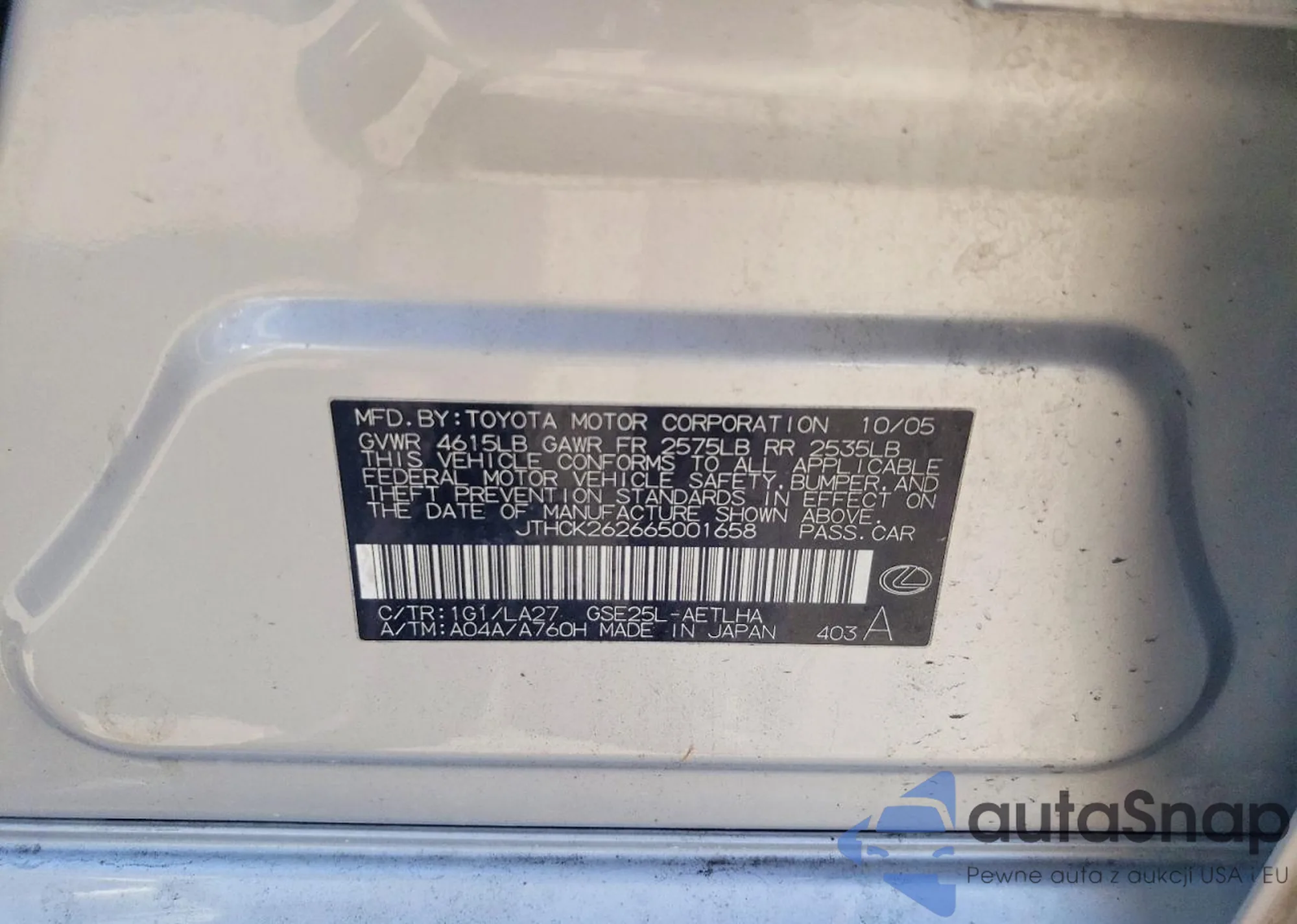 LOT: 45947486 VIN: JTHCK262665001658