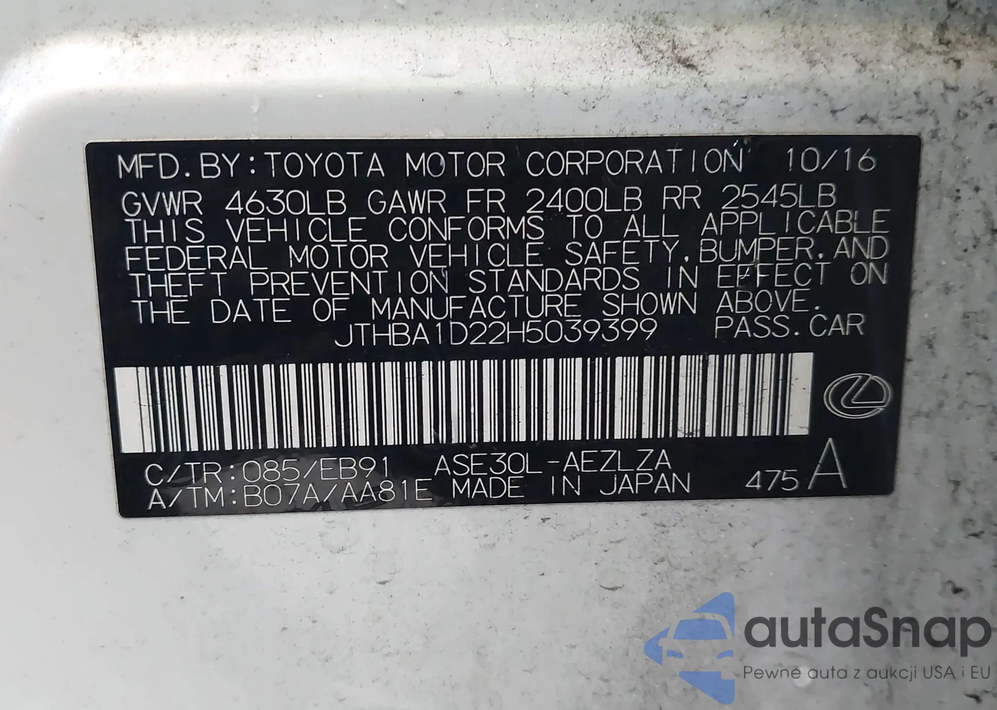 LOT: 52085075 VIN: JTHCM1D27G5012970