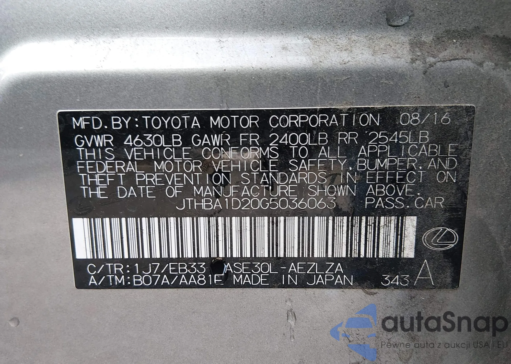 LOT: 44225310 VIN: JTHBA1D20G5036063