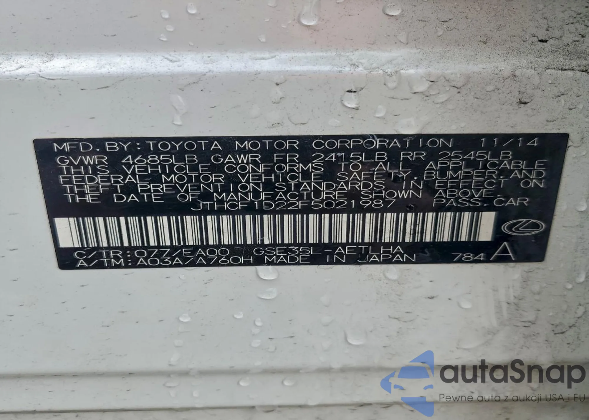 LOT: 43969076 VIN: JTHBF1D27F5077922