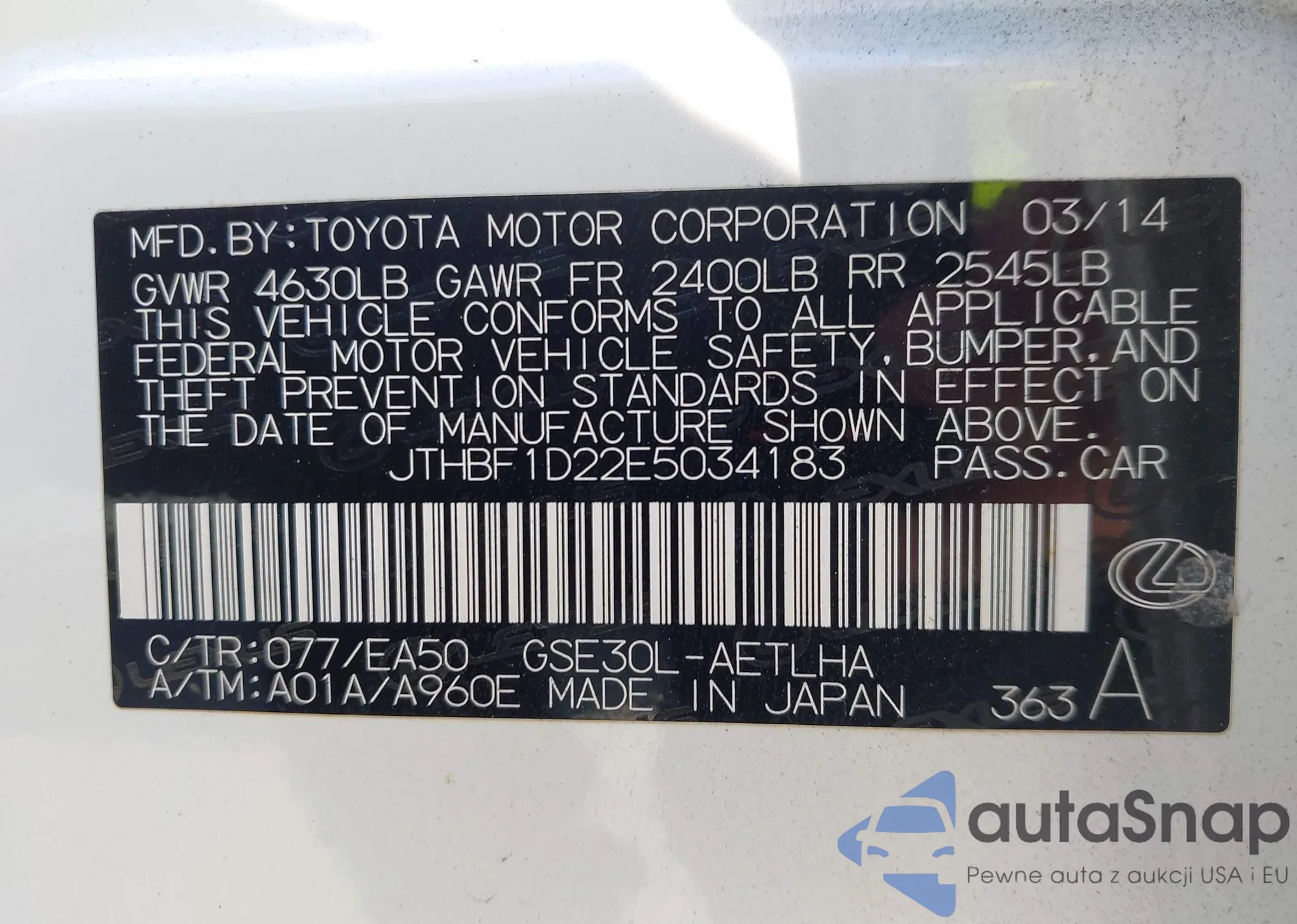 LOT: 44310256 VIN: JTHBF1D22E5034183
