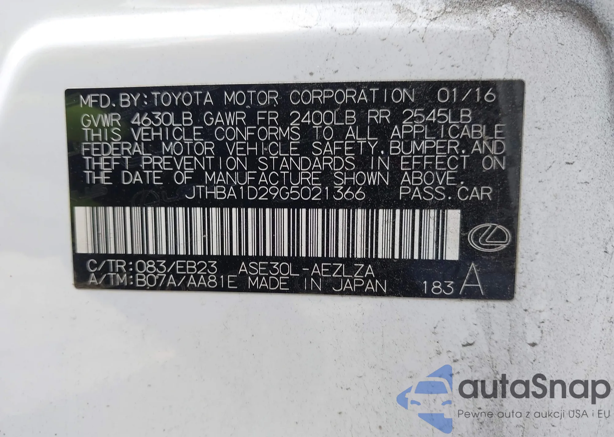 LOT: 44366804 VIN: JTHBA1D29G5021366