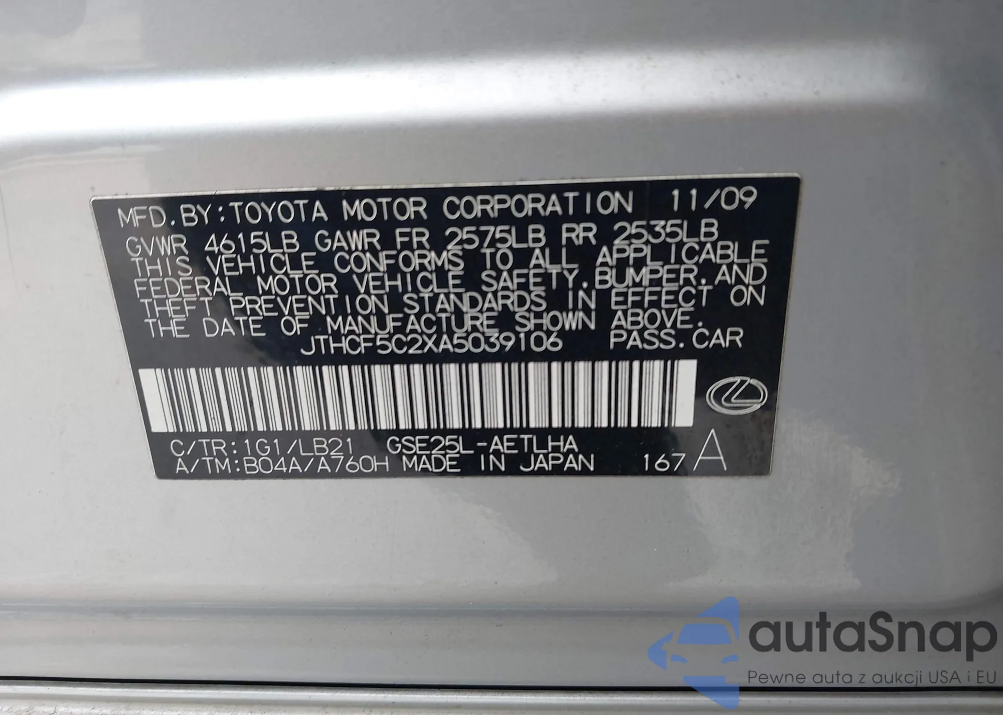 LOT: 43277937 VIN: JTHCF5C2XA5039106