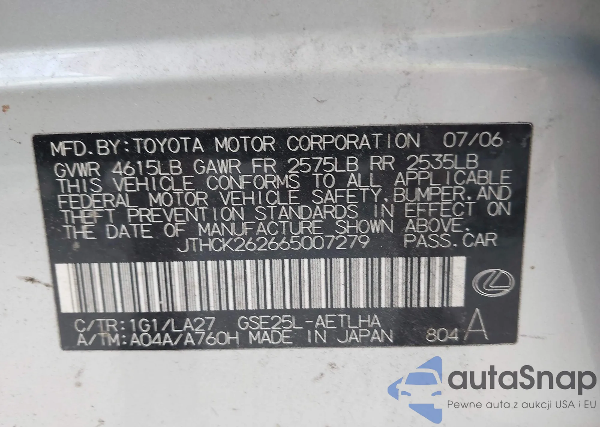 LOT: 43301354 VIN: JTHCK262665007279