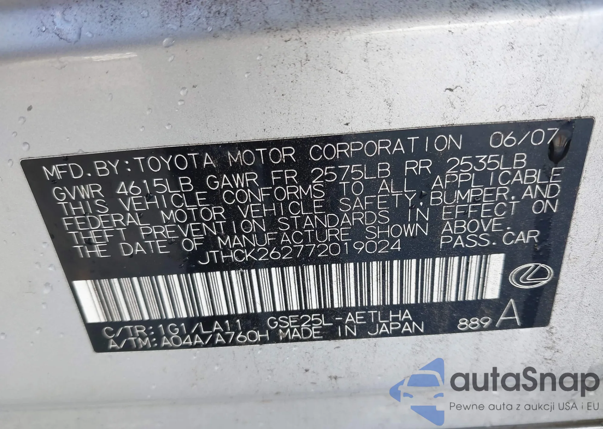 LOT: 44360087 VIN: JTHCK262772019024