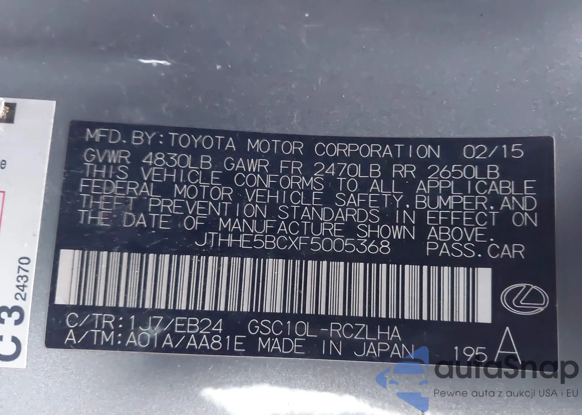 LOT: 99218525 VIN: JTHSE5BC2F5001661