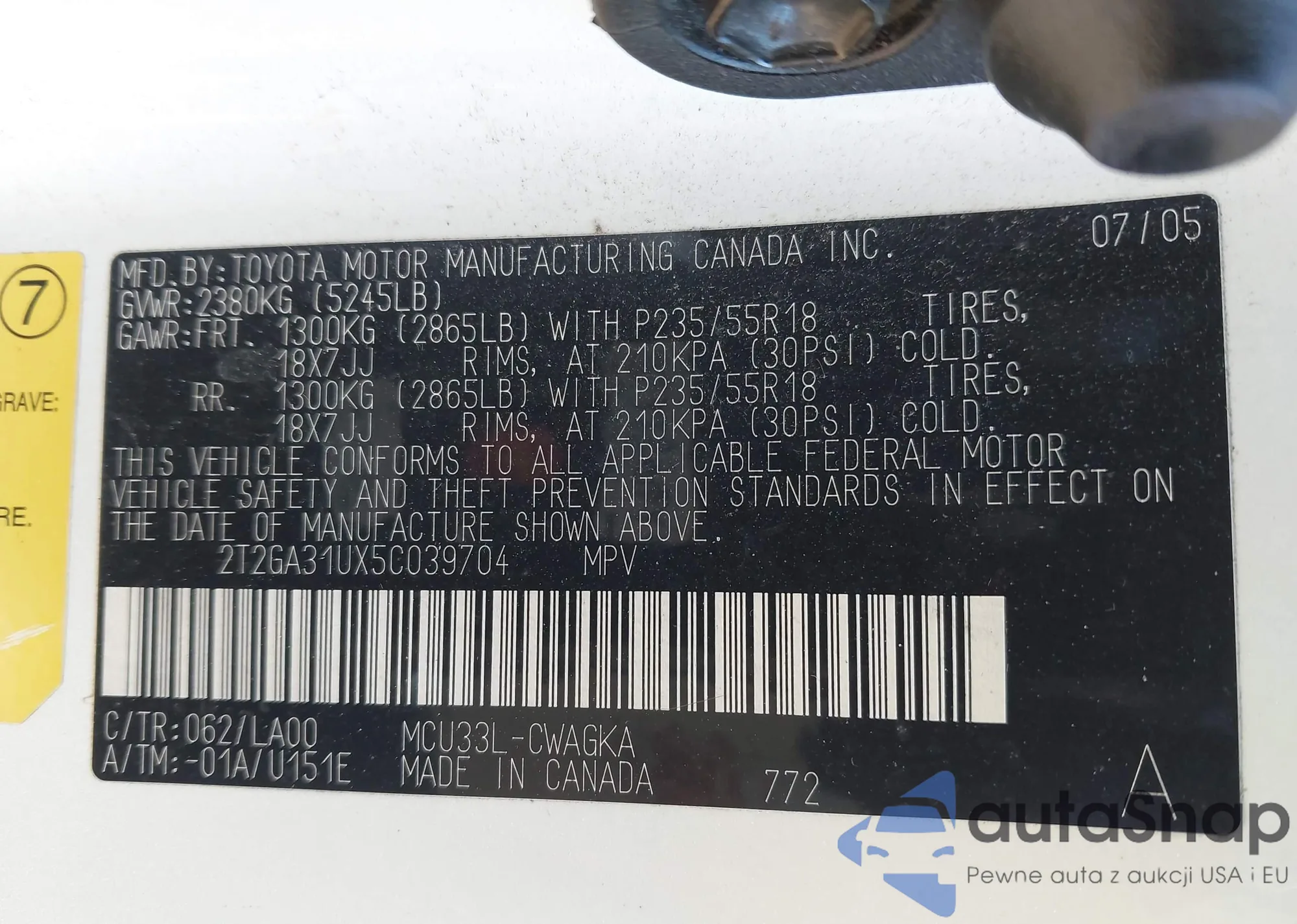 • VIN 2T2GA31UX5C037094