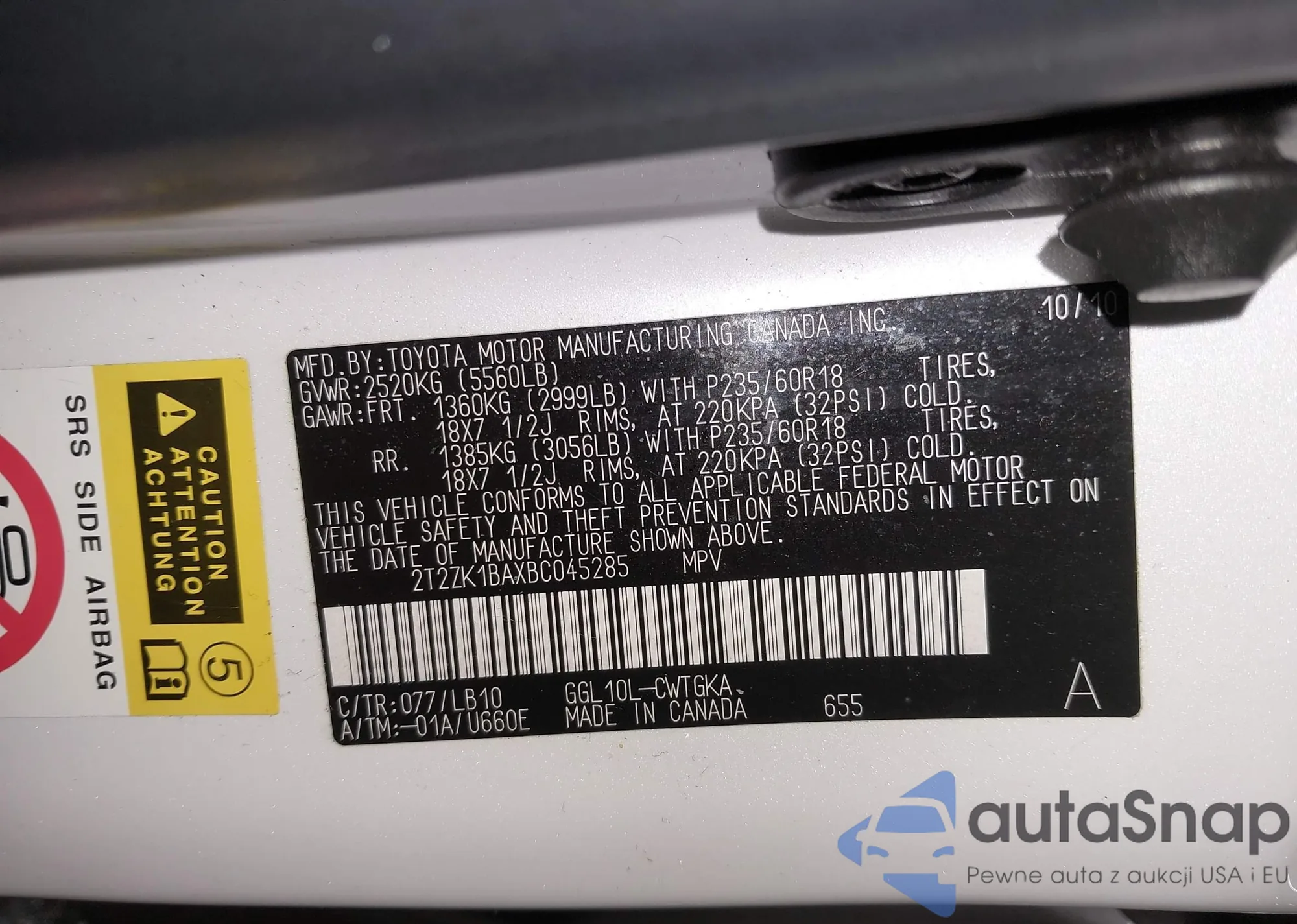 • VIN 2T2ZK1BA7AC011061