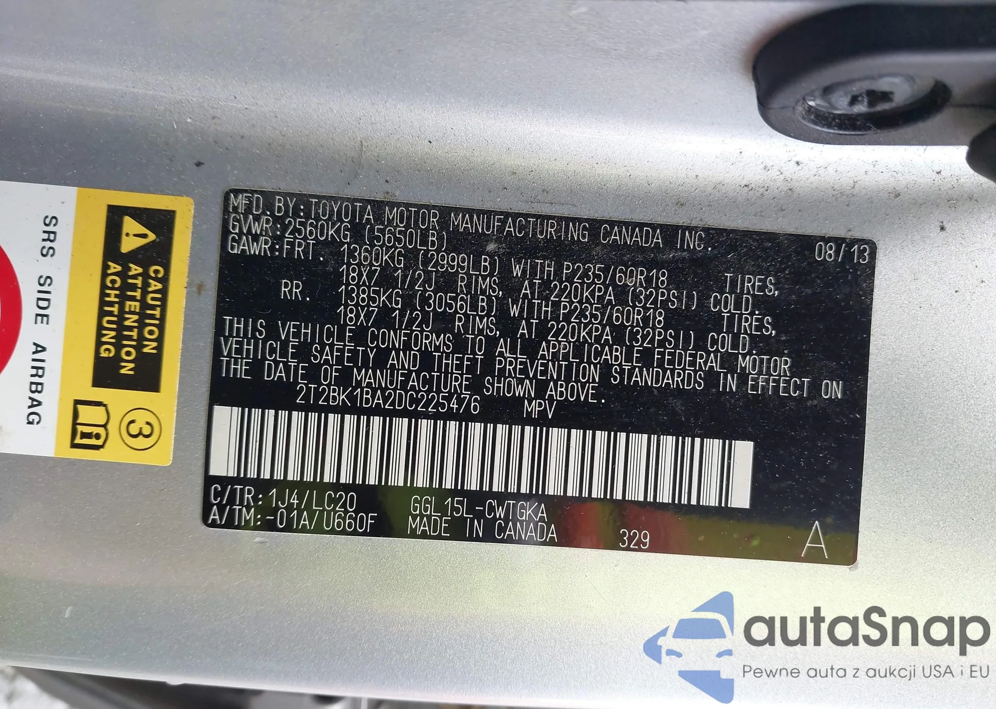 • VIN 2T2BK1BA2DC225476