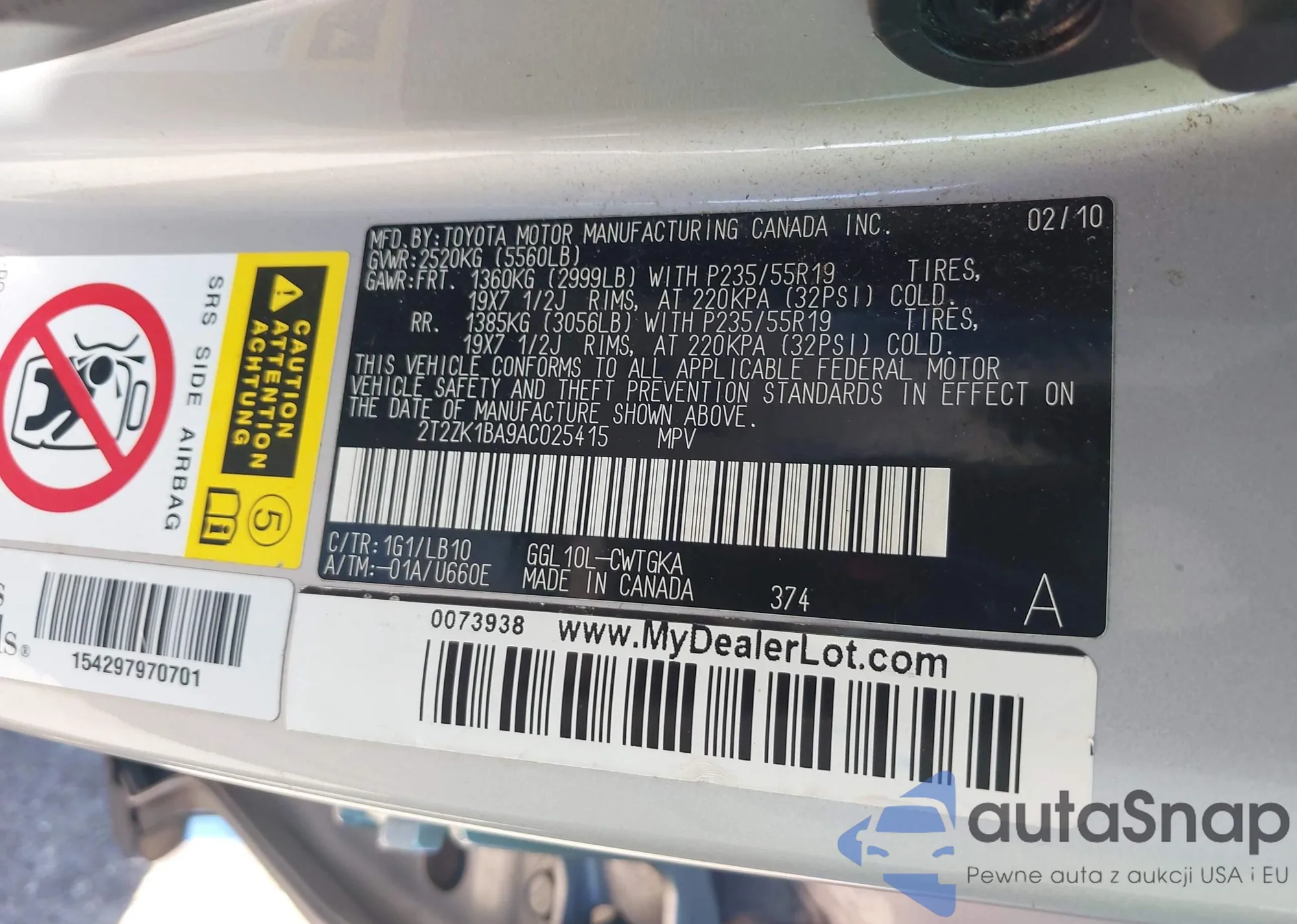 • VIN 2T2ZK1BA9AC025415
