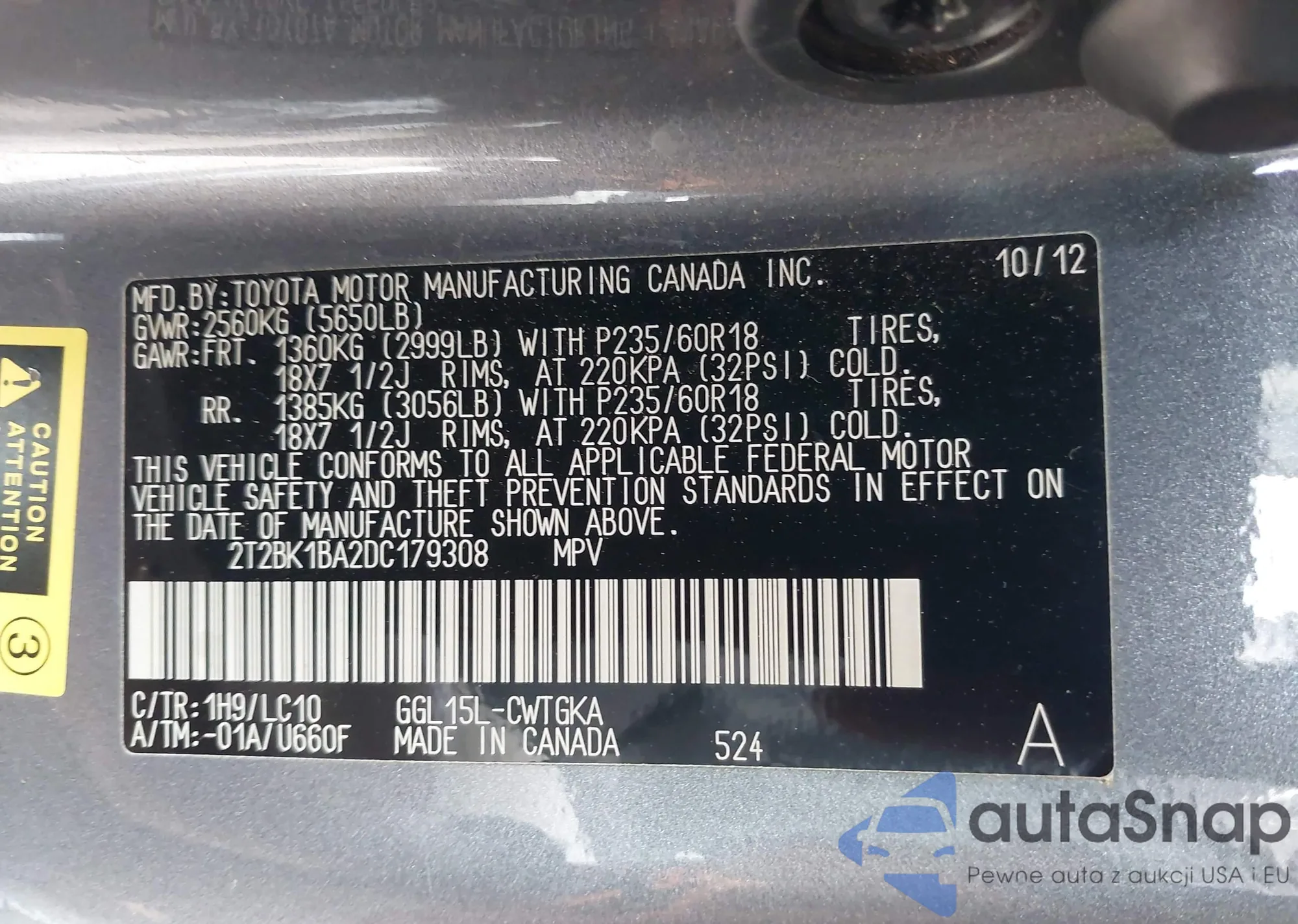 • VIN 2T2BK1BA2DC179308