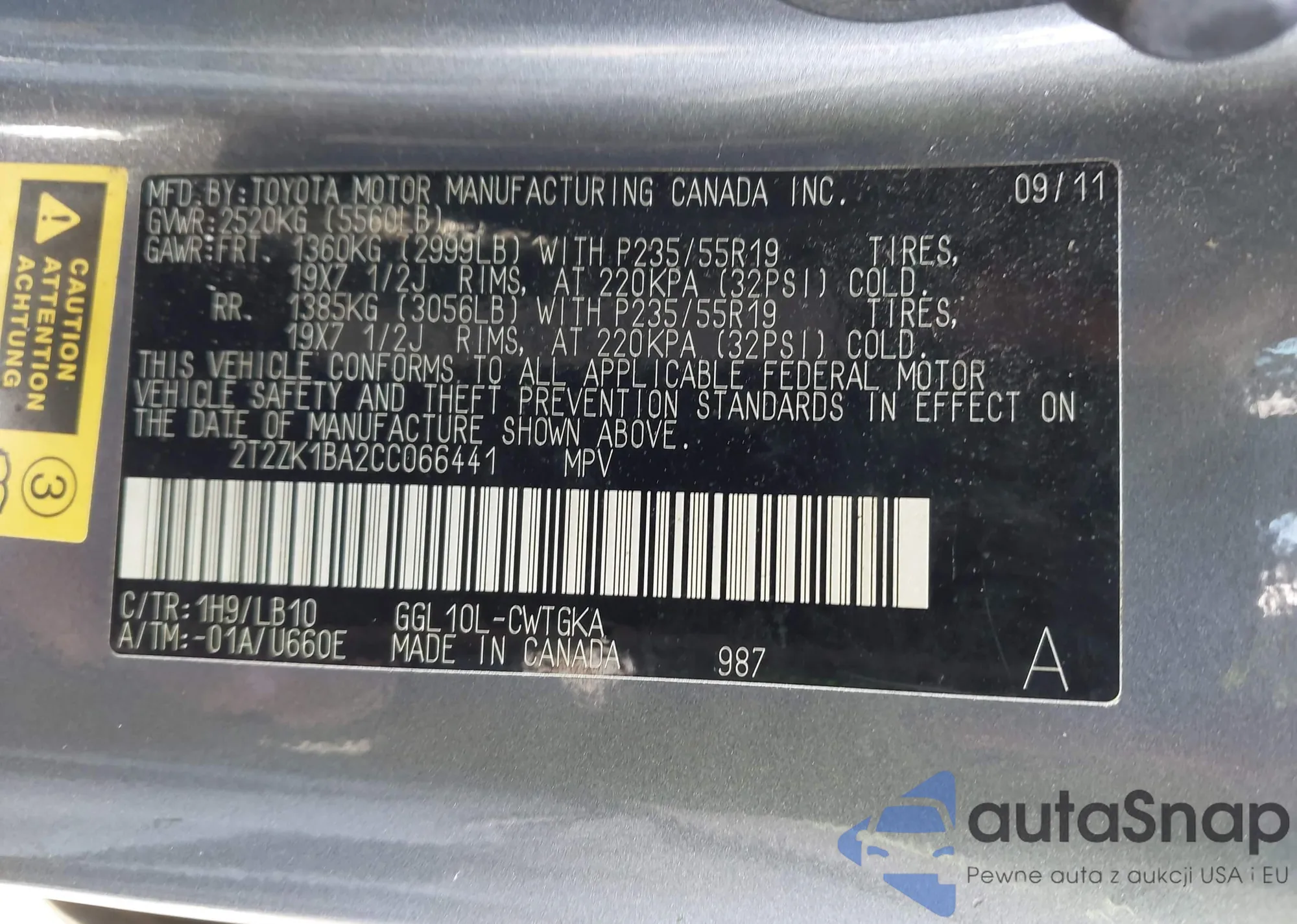 • VIN 2T2ZK1BA2CC066441