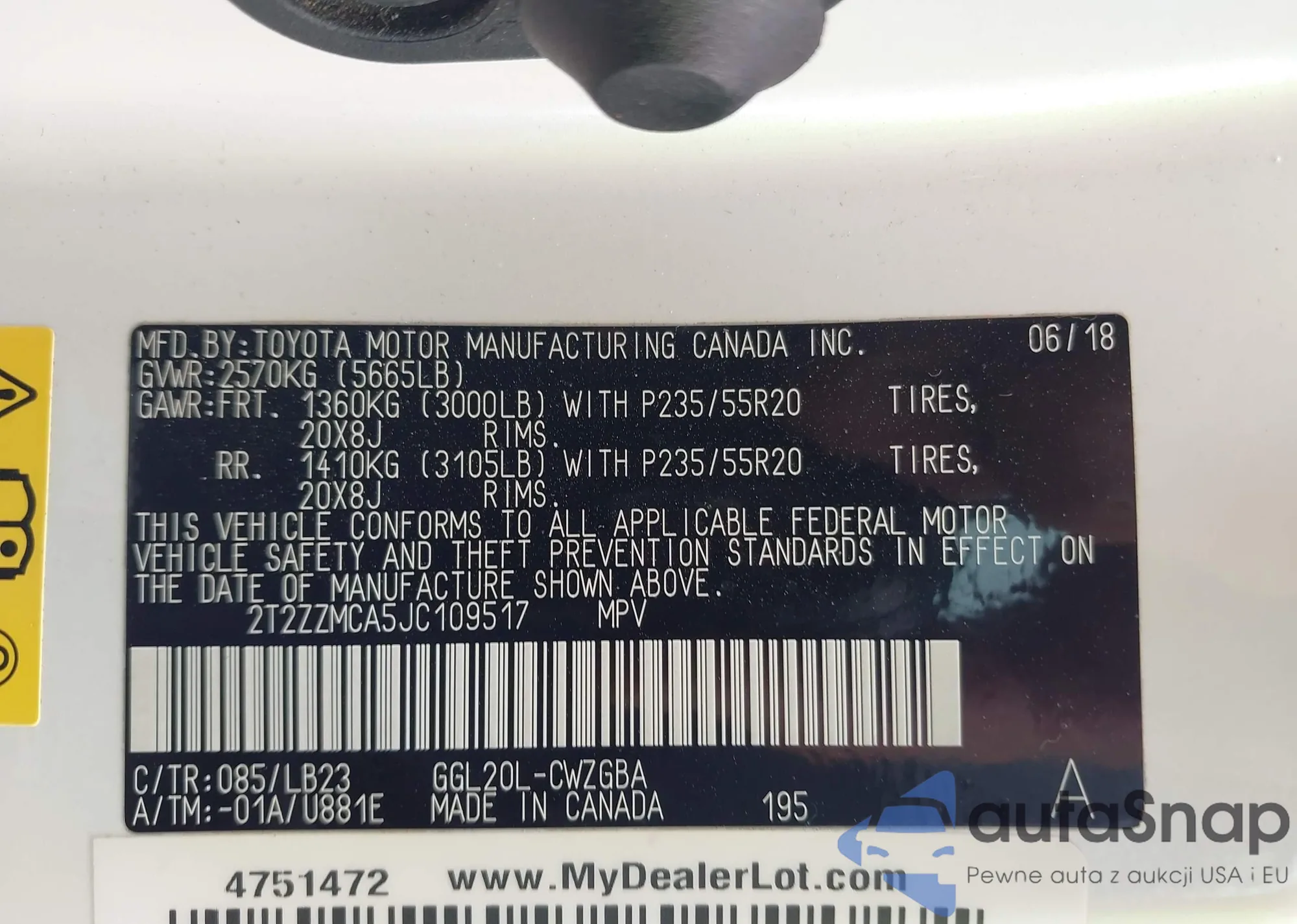 LOT: 43577905 VIN: JTJGZKCA2J2003795