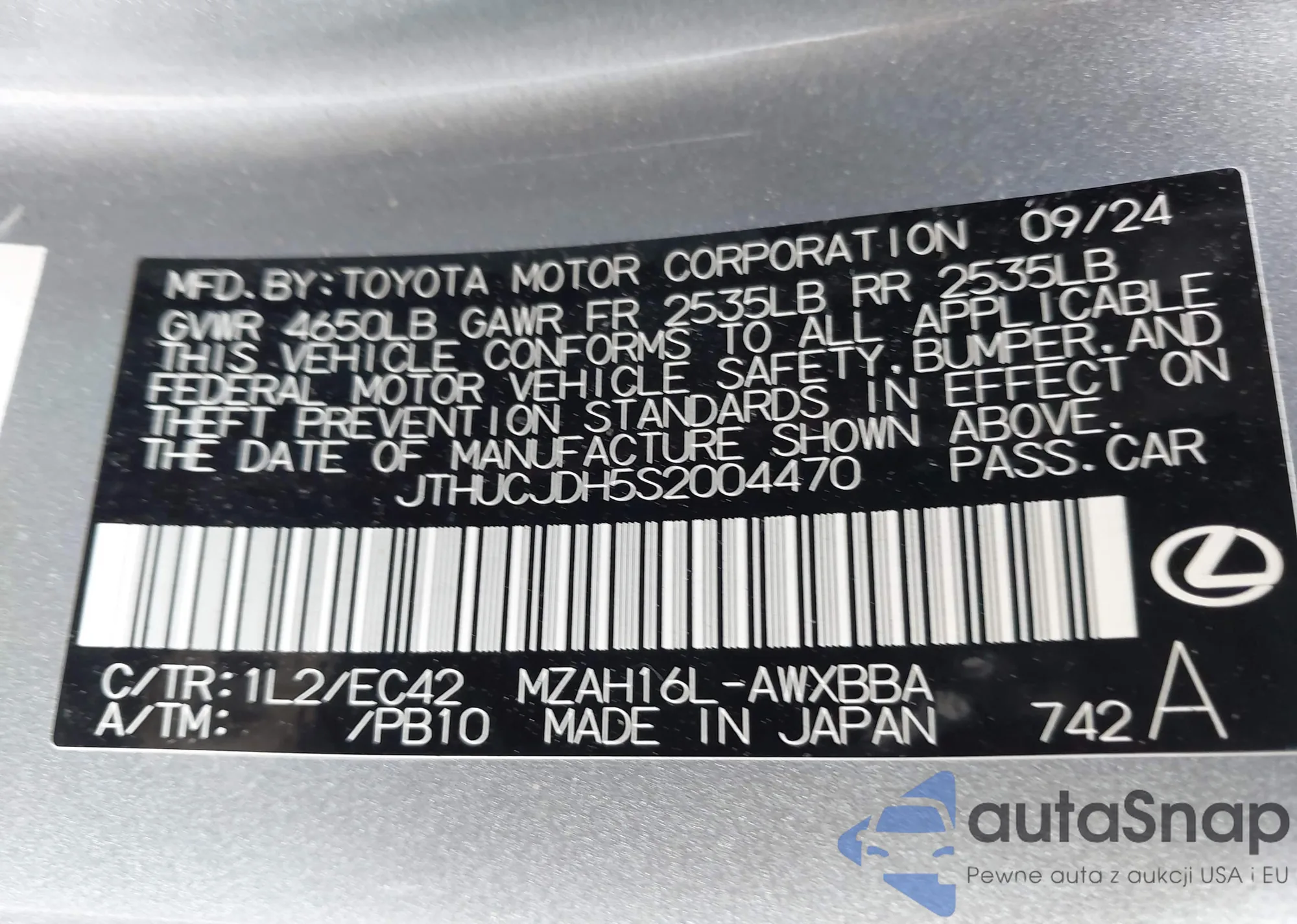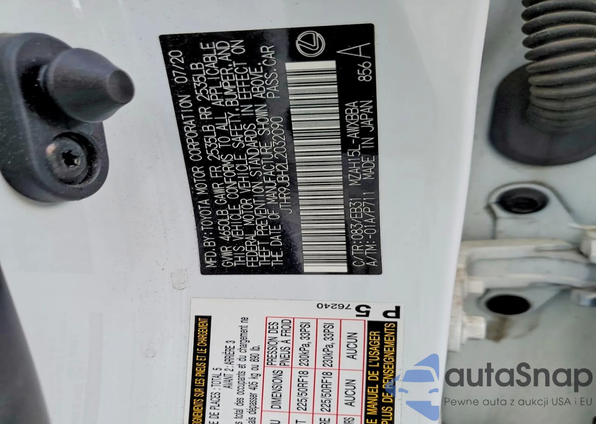 LOT: 74394475 VIN: JTHP9JBH9L2036001