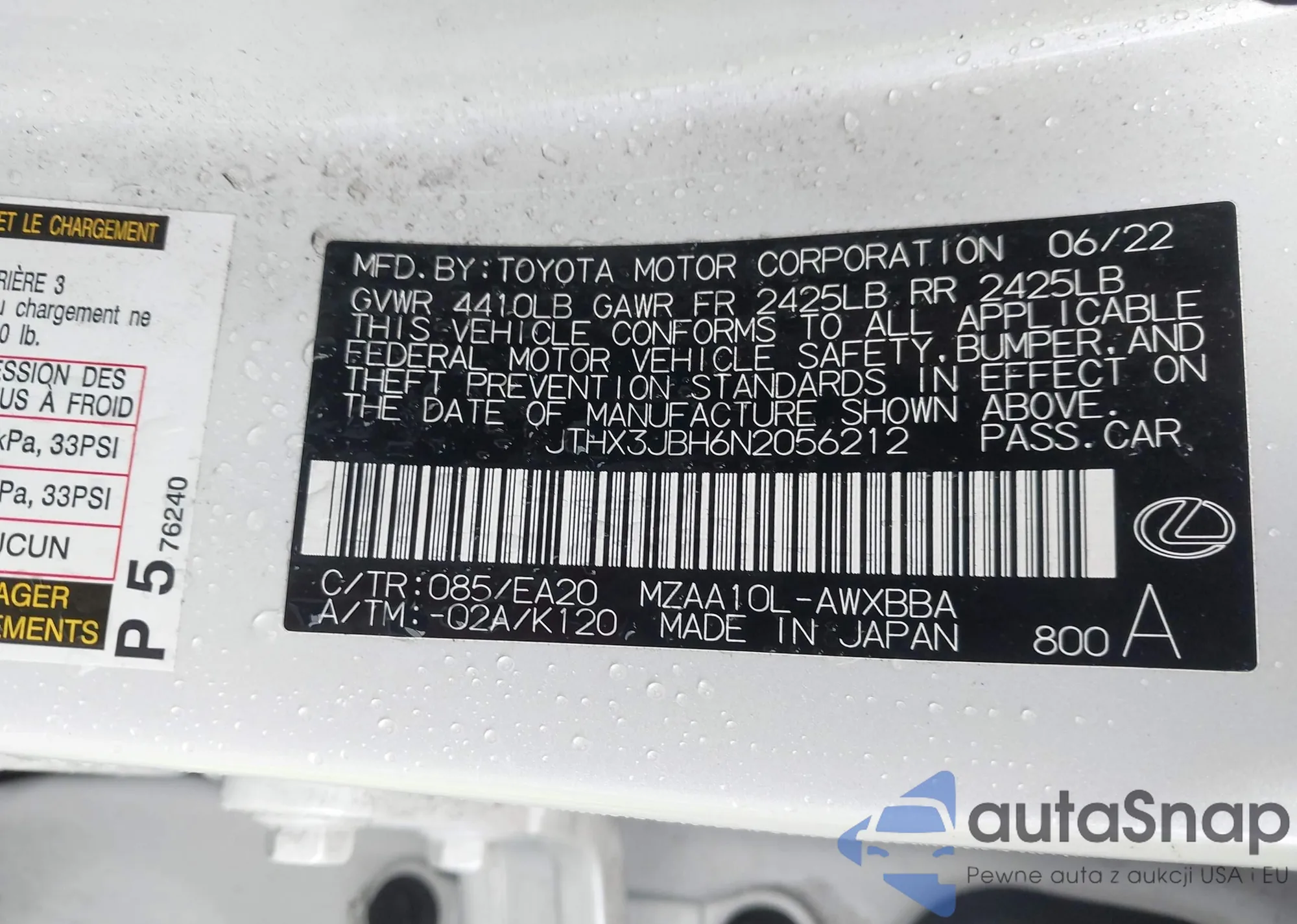 LOT: 44326558 VIN: JTHX3JBH6N2056212