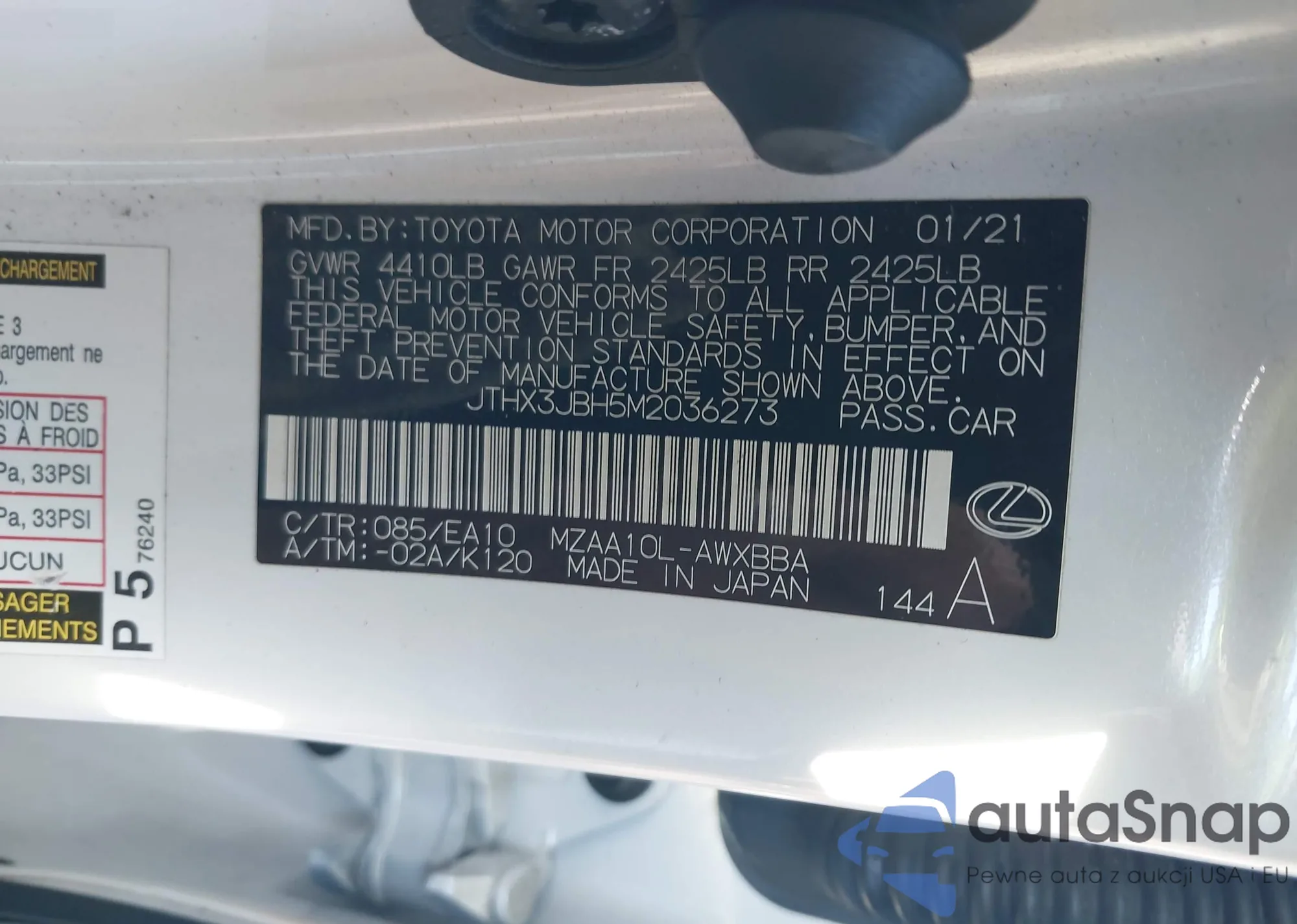 LOT: 44363073 VIN: JTHX3JBH5M2036273