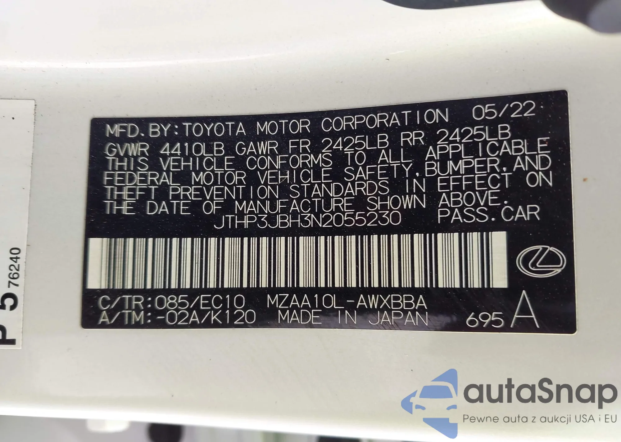 LOT: 44432677 VIN: JTHP3JBH3N2055230
