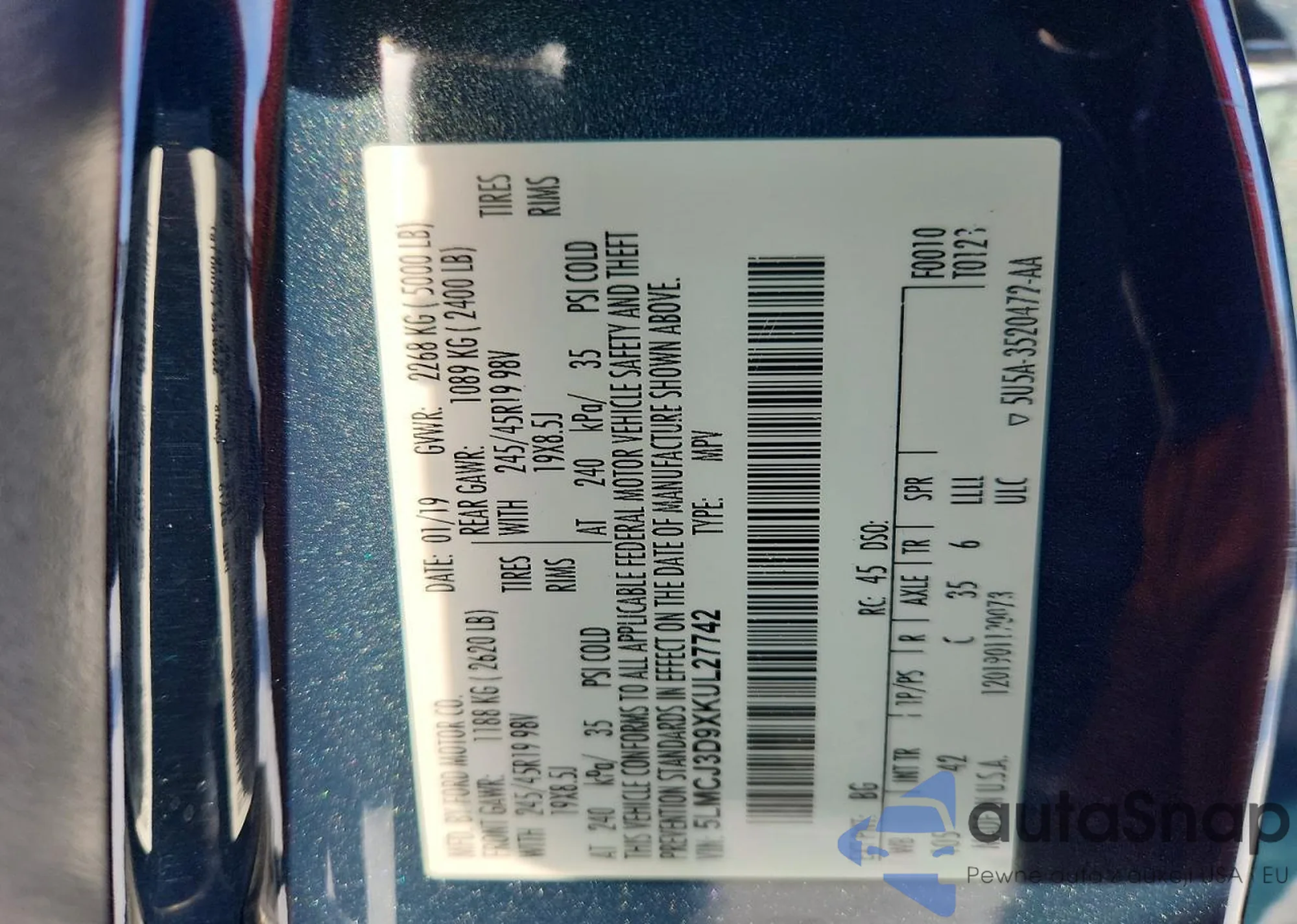 LOT: 43929970 VIN: 5LMTJ3DH8KUL31599