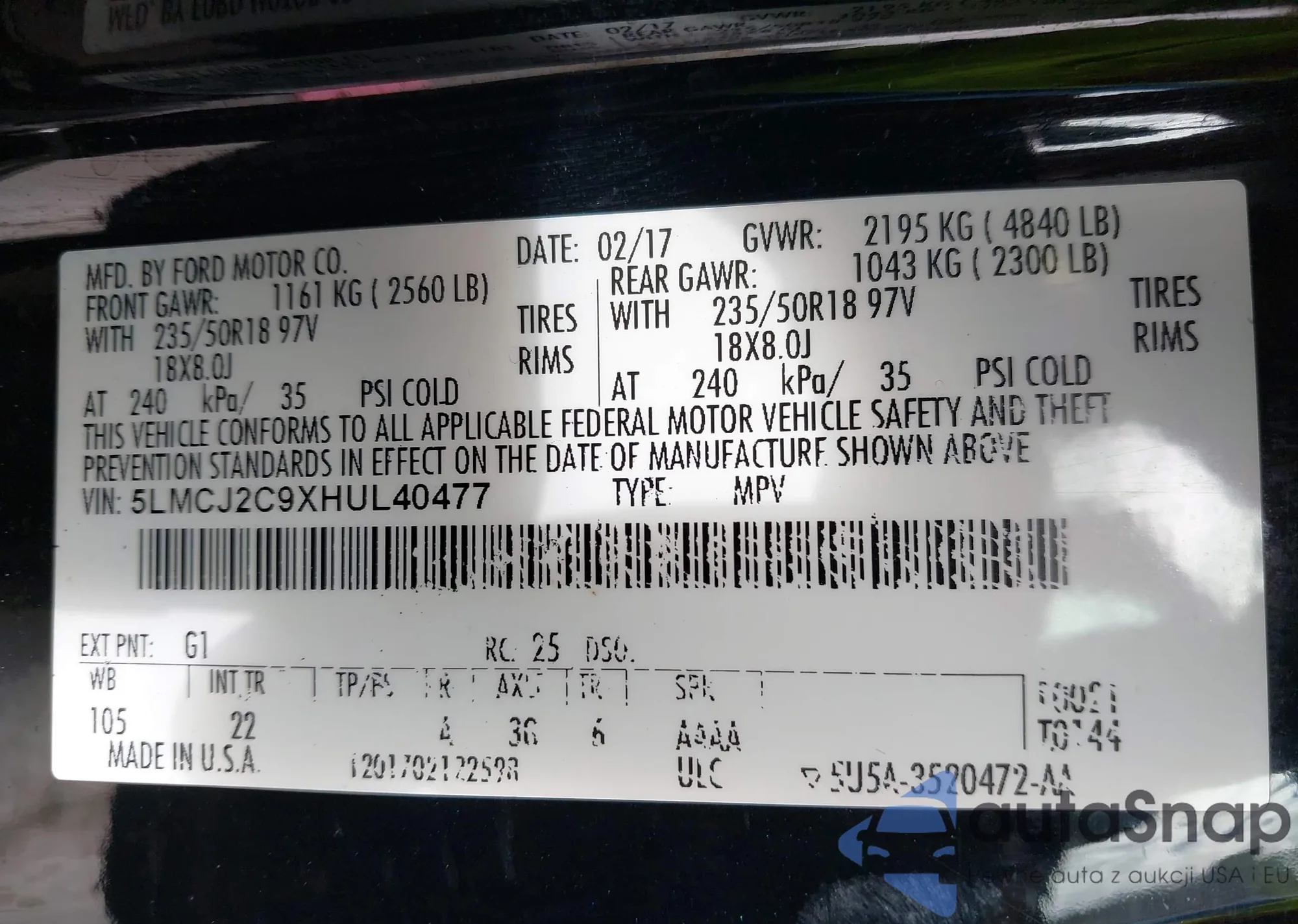 LOT: 43300373 VIN: 5LMTJ3DH9HUL12682