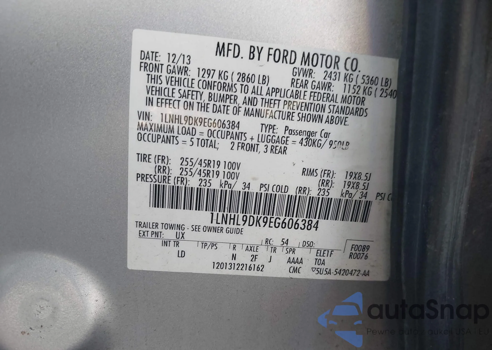 LOT: 43908308 VIN: 1LNHL9DK9EG606384