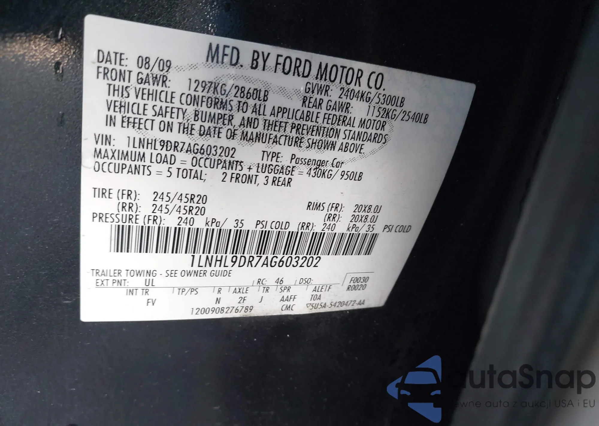 • VIN 1LNHL9DR7AG603202