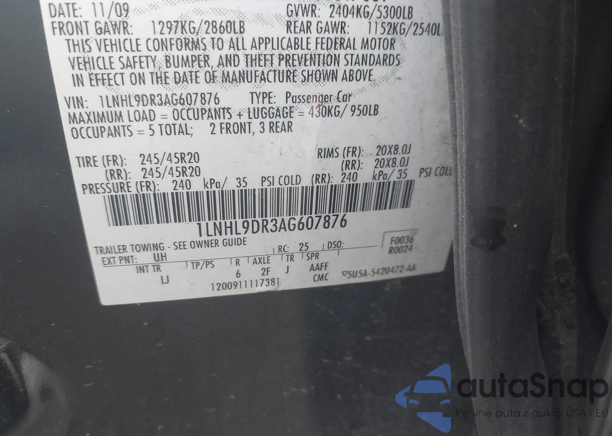 • VIN 1LNHL9DR3AG607876