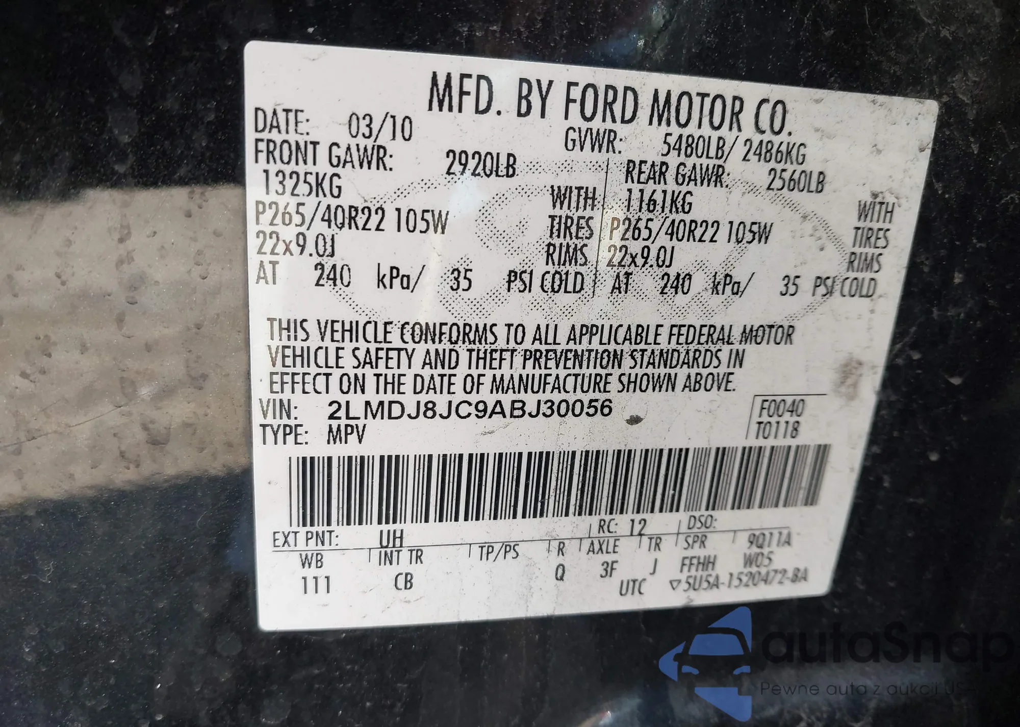 LOT: 43505661 VIN: 2LMDJ8JC9ABJ30056
