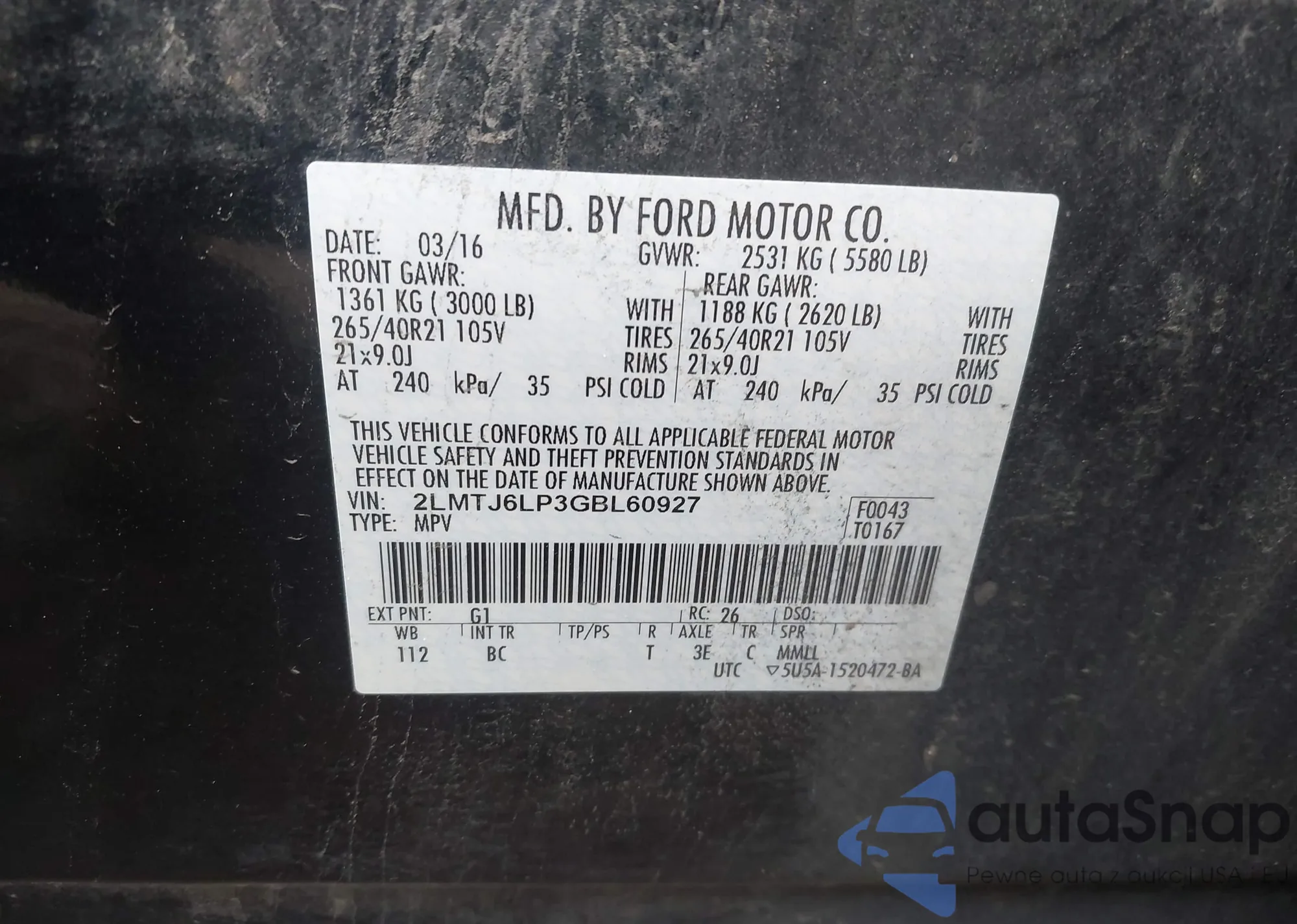 LOT: 44035149 VIN: 2LMTJ6LP3GBL60927