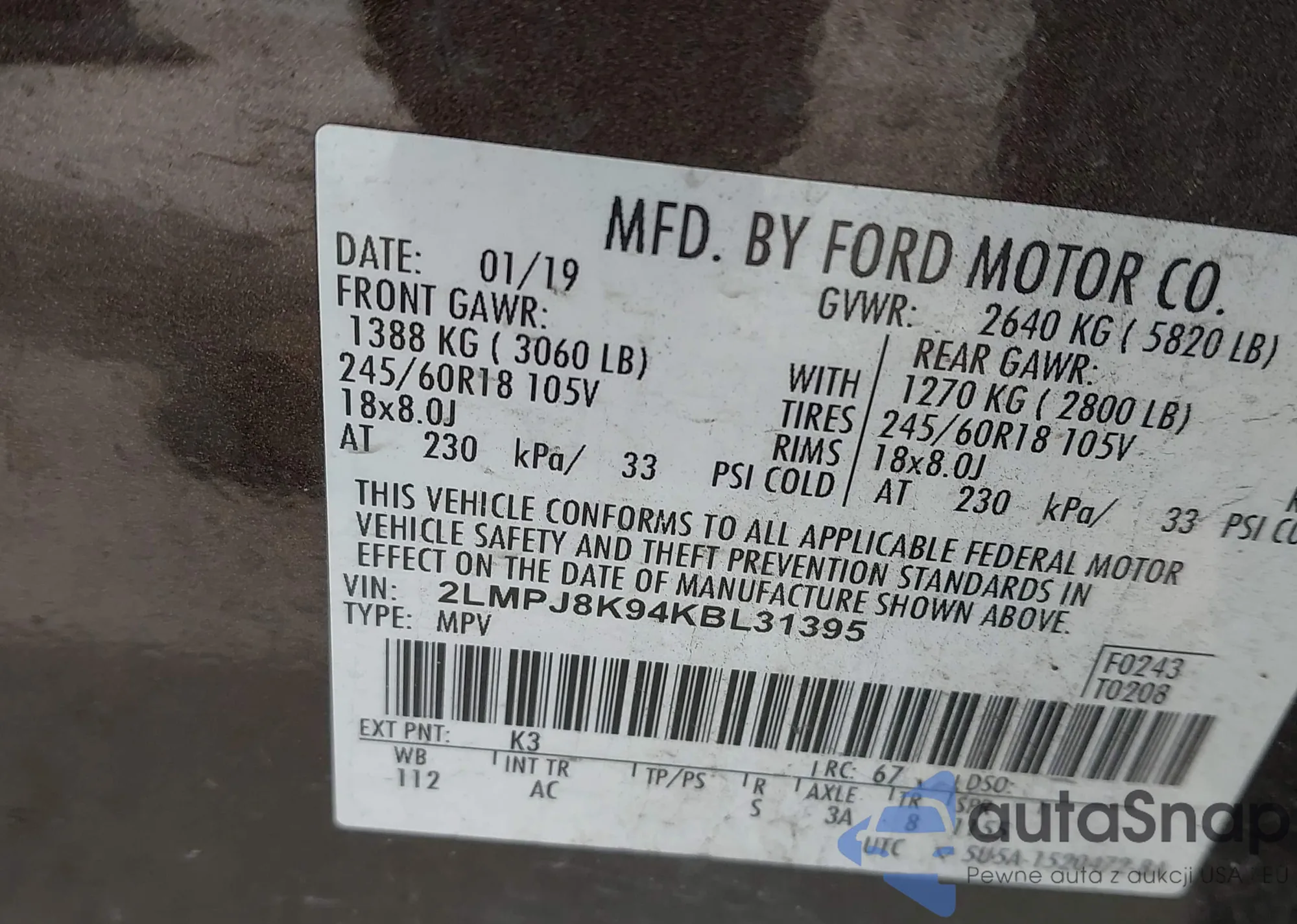 LOT: 44595521 VIN: 2LMPJ8LP3KBL45947