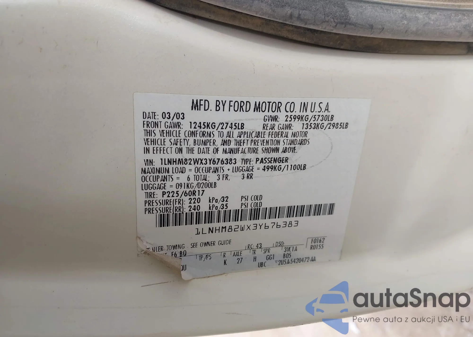 LOT: 44096553 VIN: 1LNHM82WX3Y676383