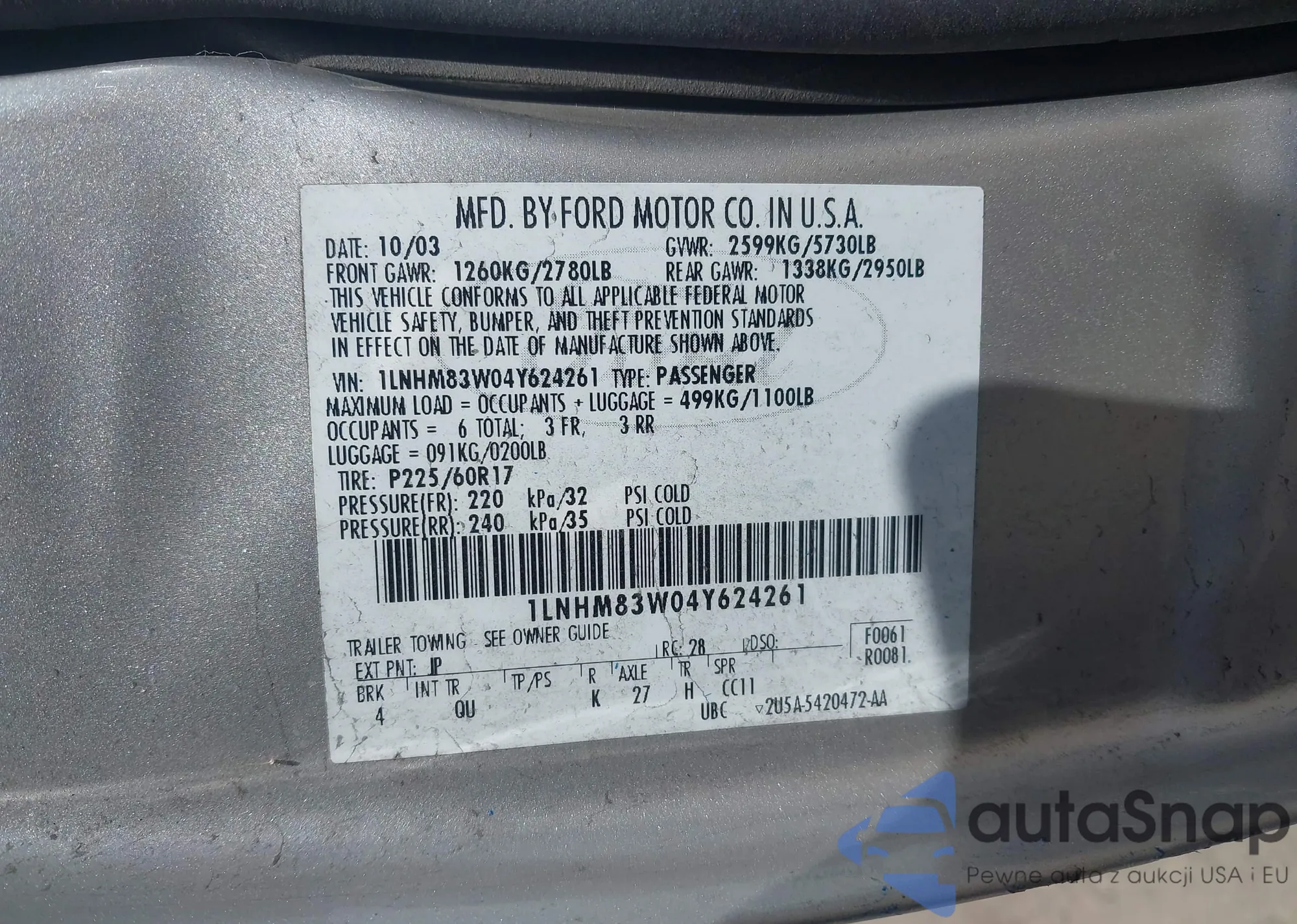 LOT: 44645148 VIN: 1LNHM83W04Y624261
