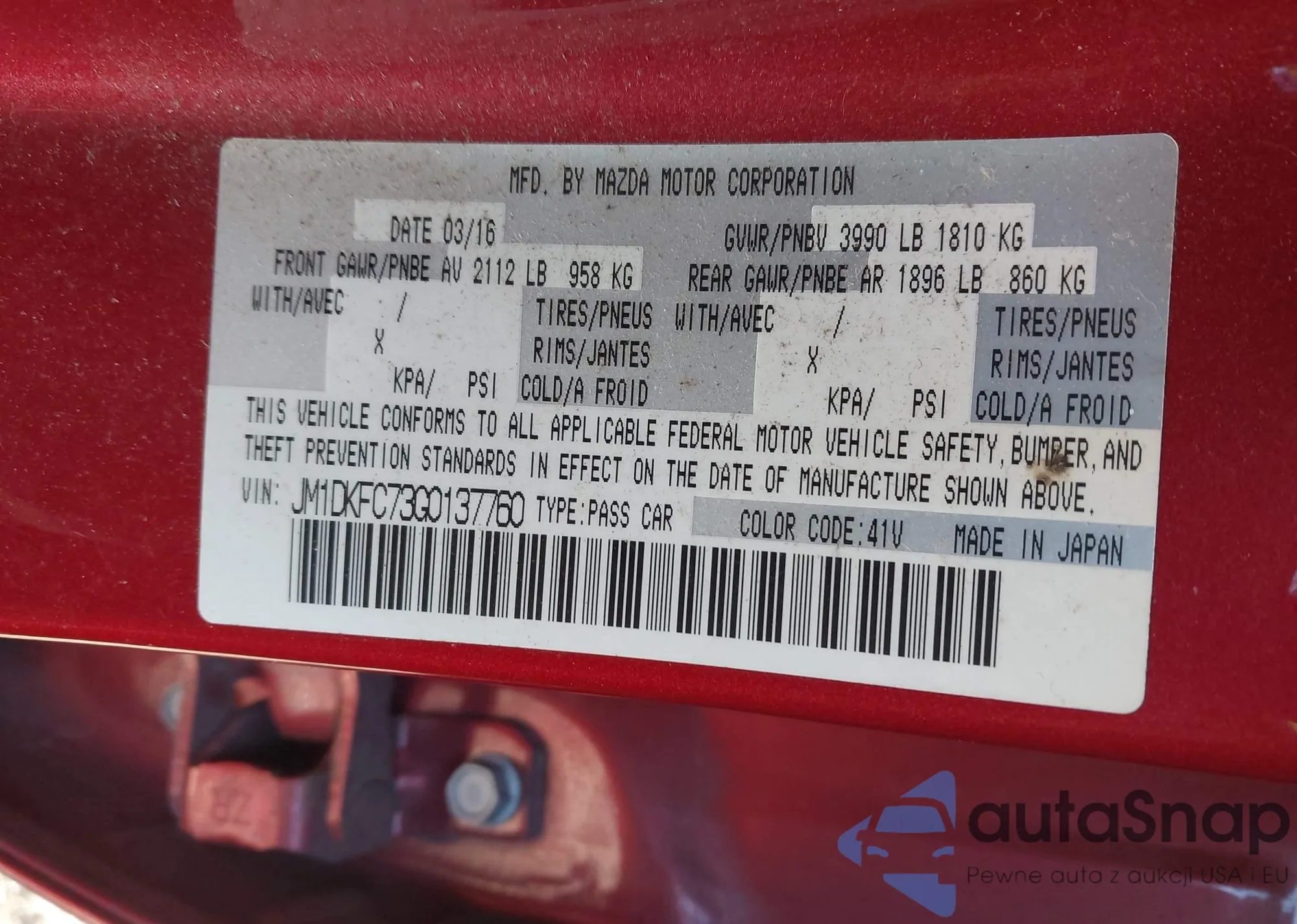 LOT: 44287591 VIN: JM1DKFC73G0137760
