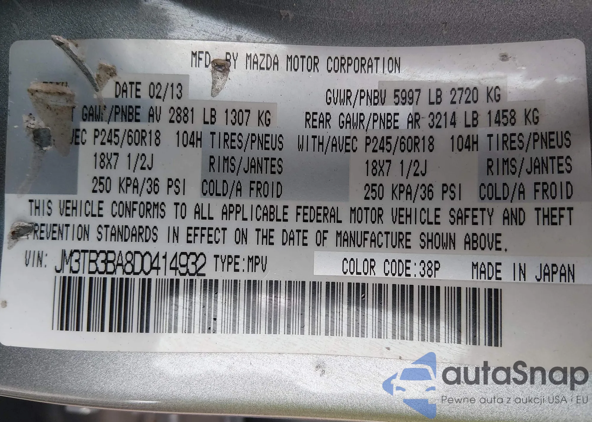 LOT: 44106036 VIN: JM3TB3BA8D0414932