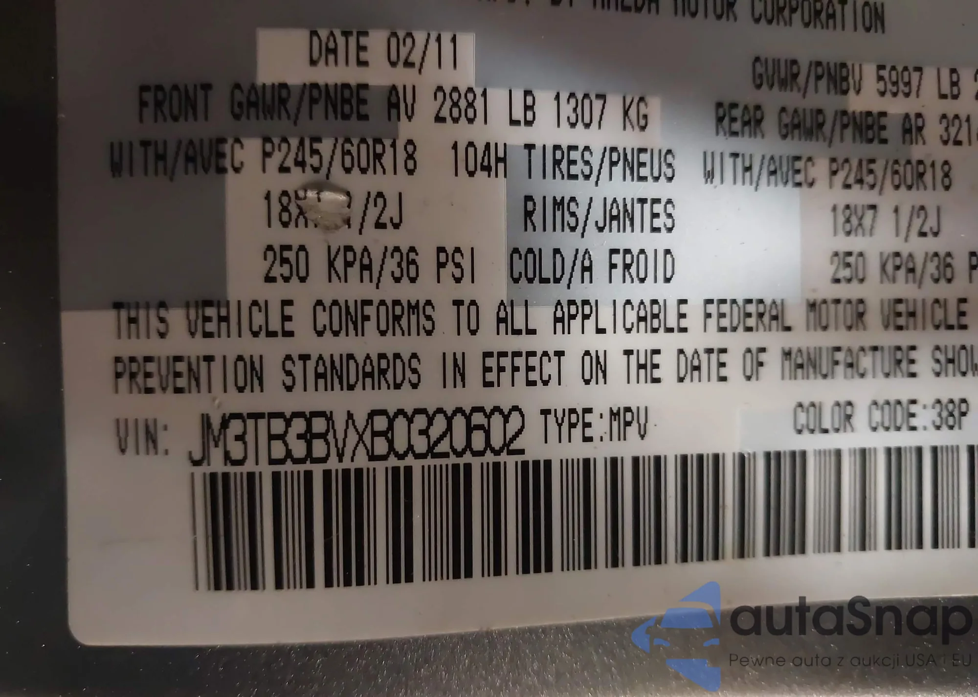 • VIN JM3TB3BVXB0320602