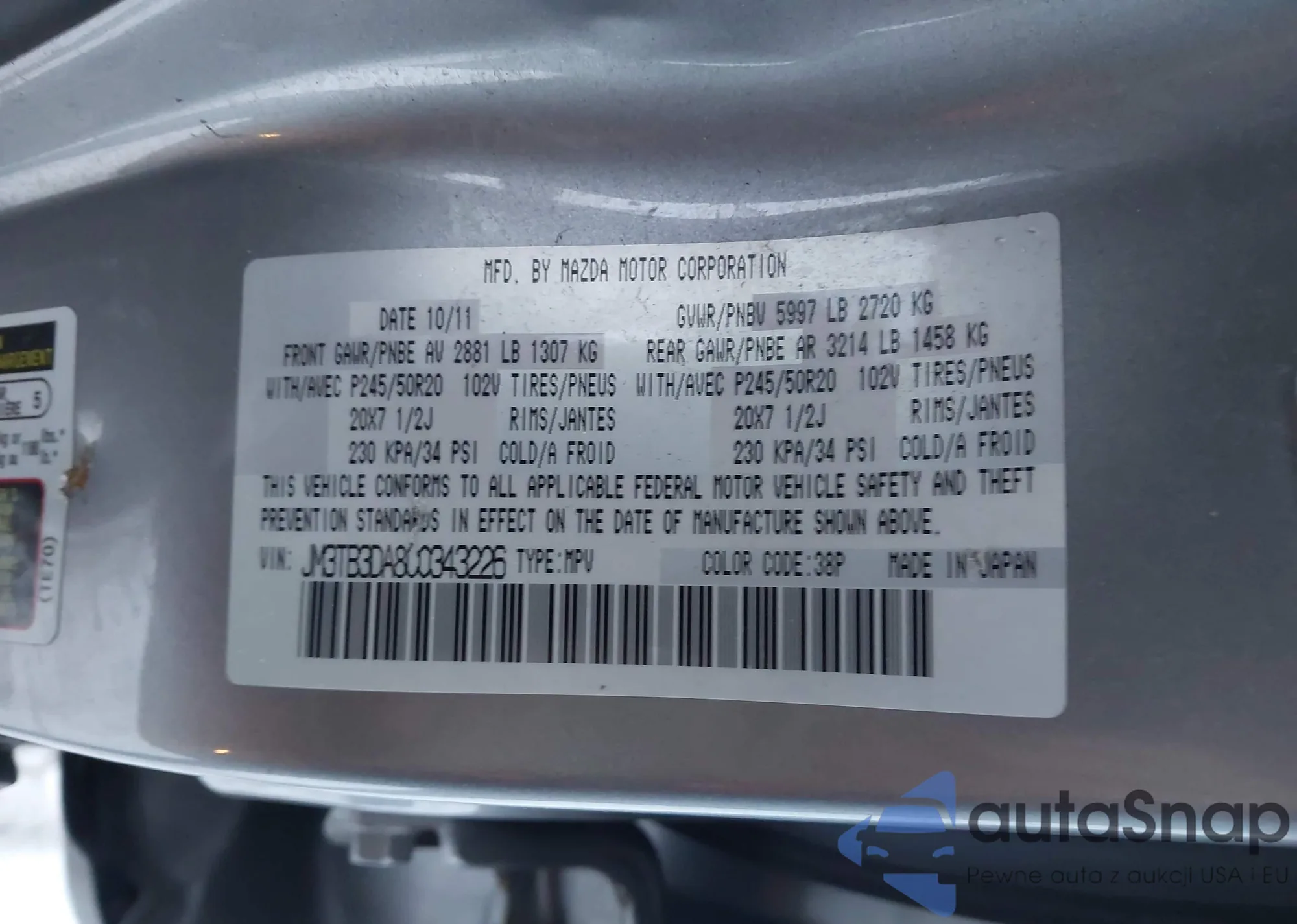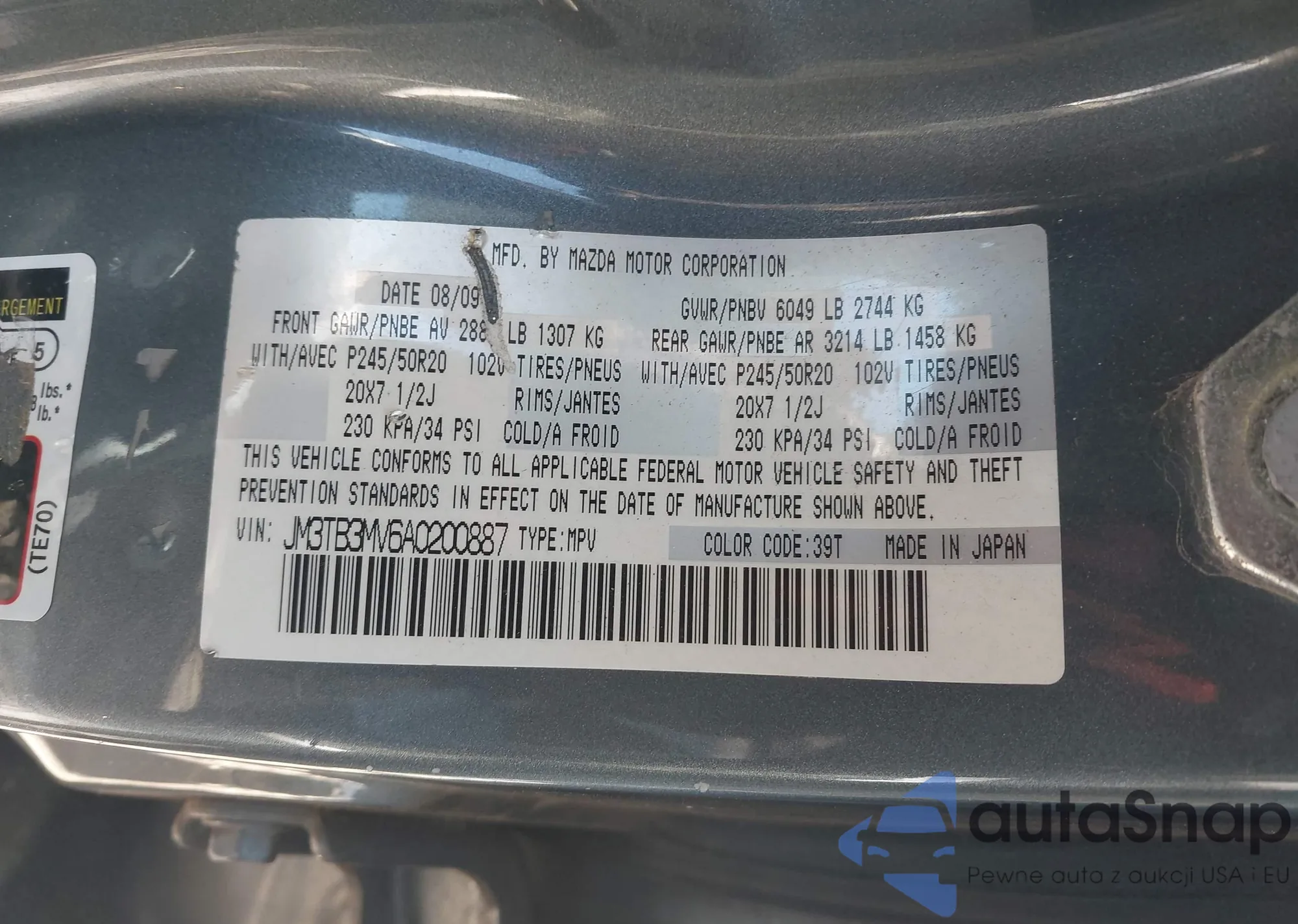 LOT: 44306744 VIN: JM3TB3MV6A0200887
