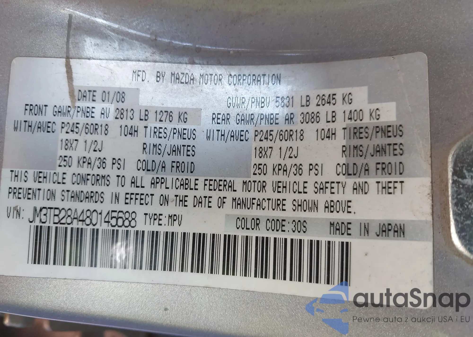 LOT: 44311614 VIN: JM3TB28A480145688