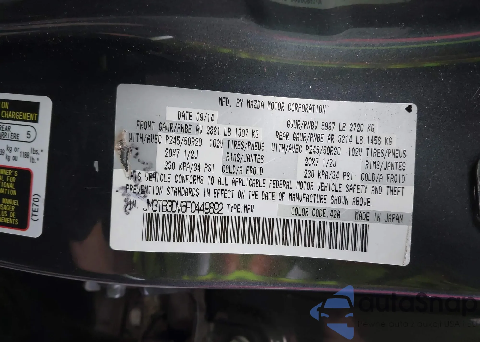 LOT: 44319702 VIN: JM3TB3DV6F0449892