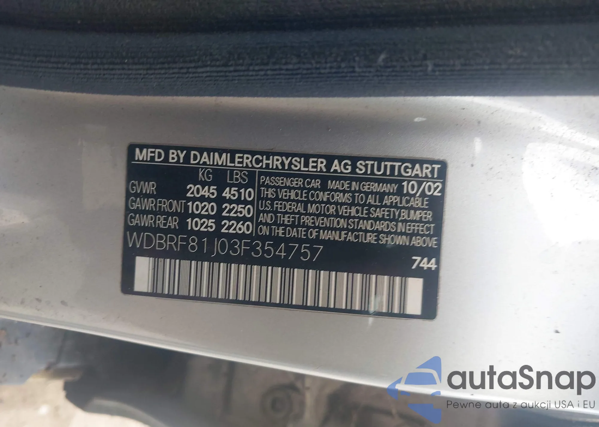 • VIN WDBRF81J03F354757