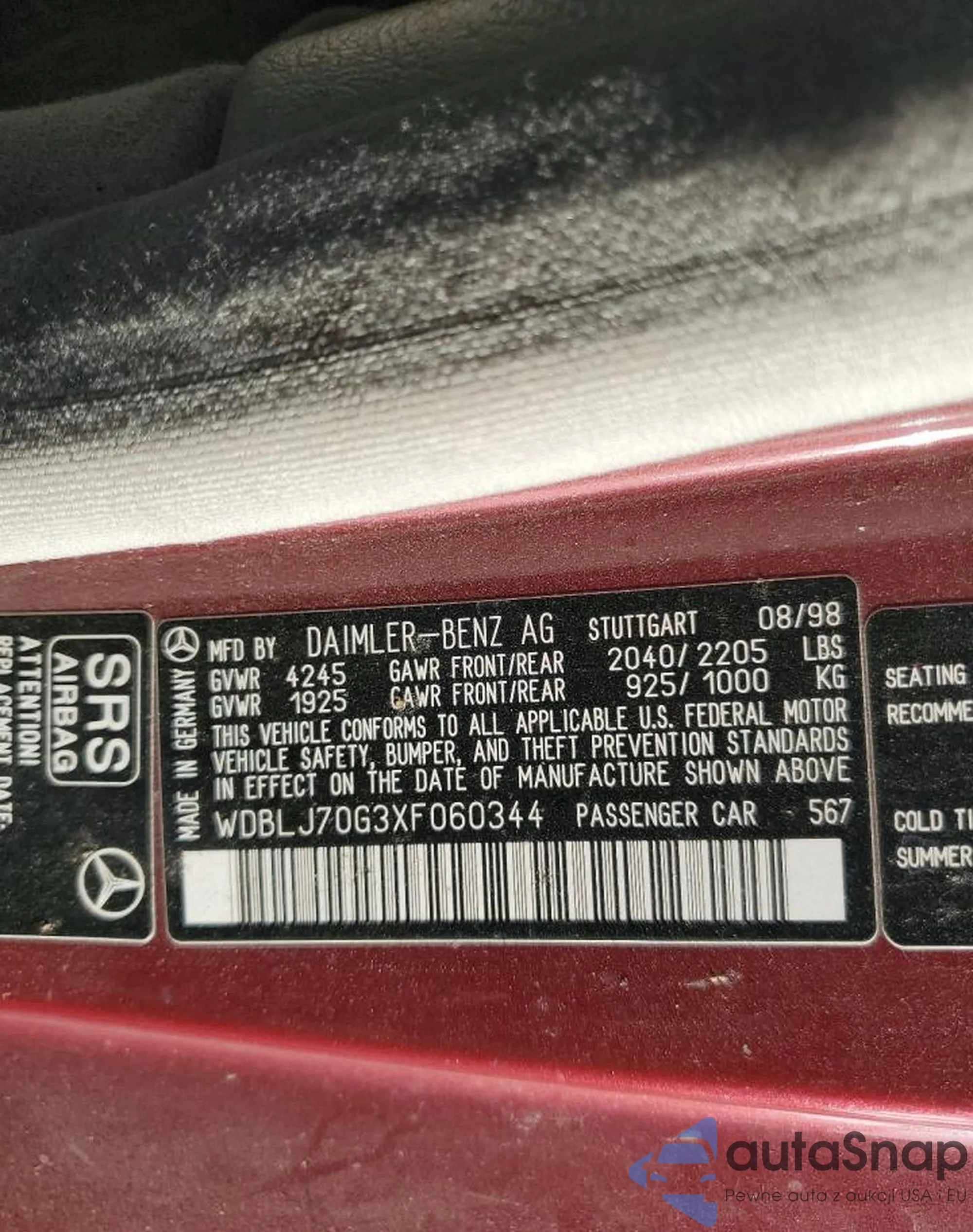LOT: 91121955 VIN: WDBLJ70G3XF060344