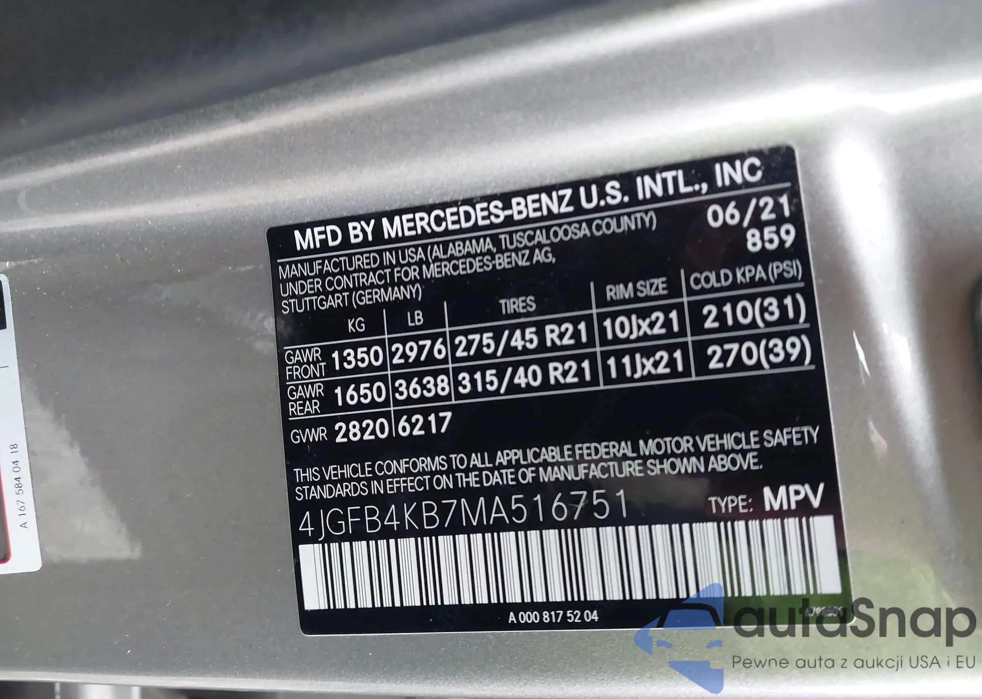 • VIN 4JGFB4KB7MA516751