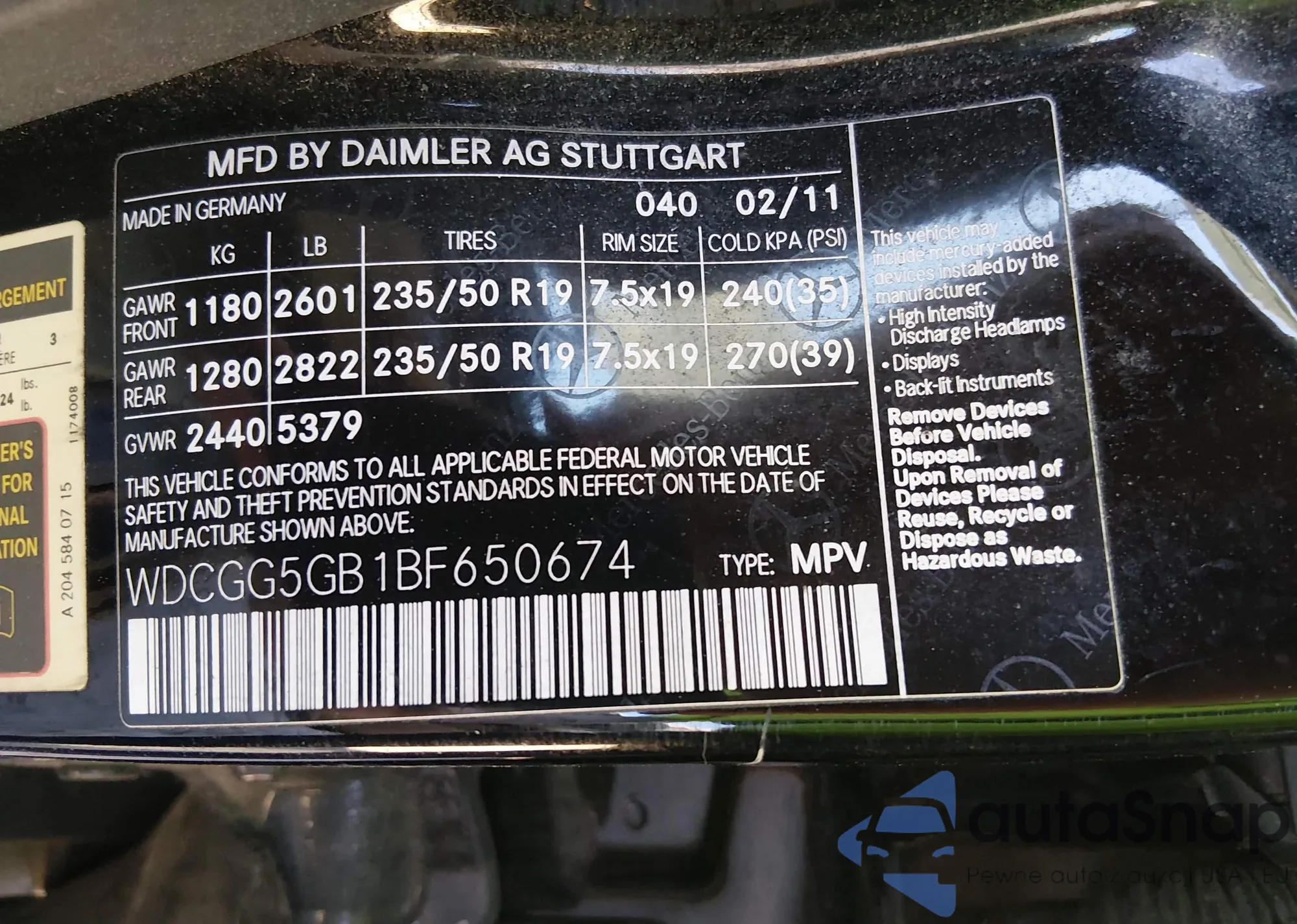 • VIN WDCGG5GB1BF650674