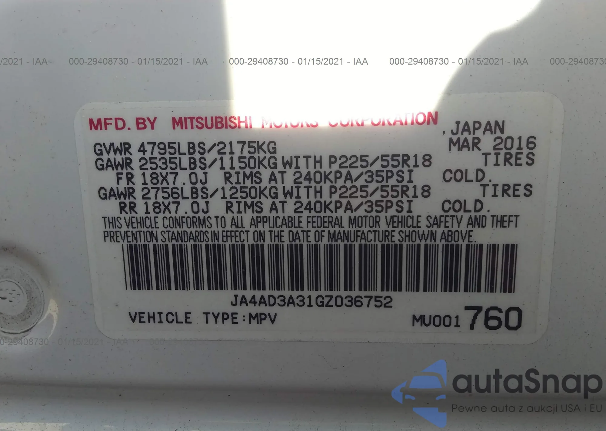 LOT: 29408730 VIN: JA4AD3A31GZ036752