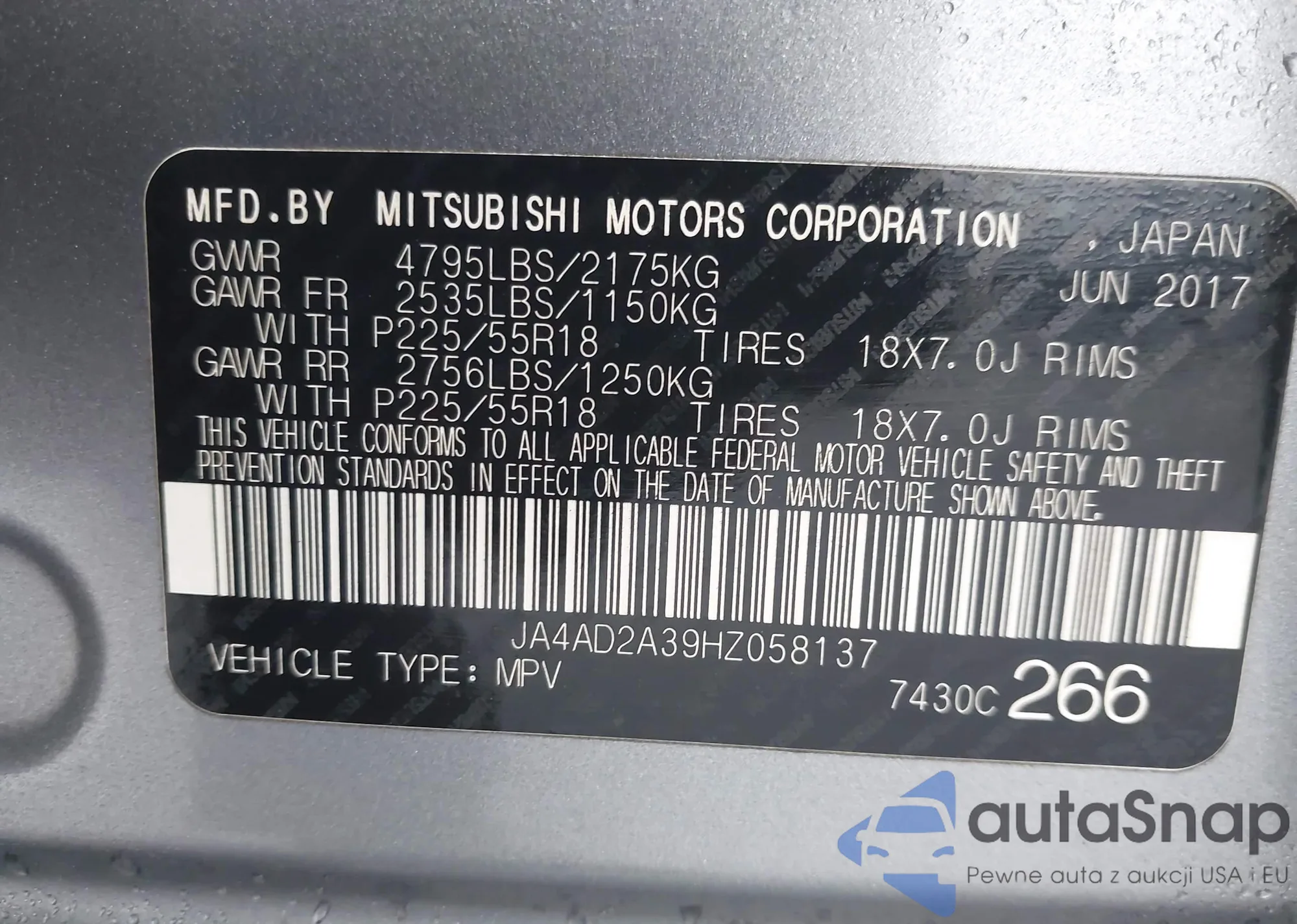 LOT: 43925663 VIN: JA4AP4AW1HZ069954