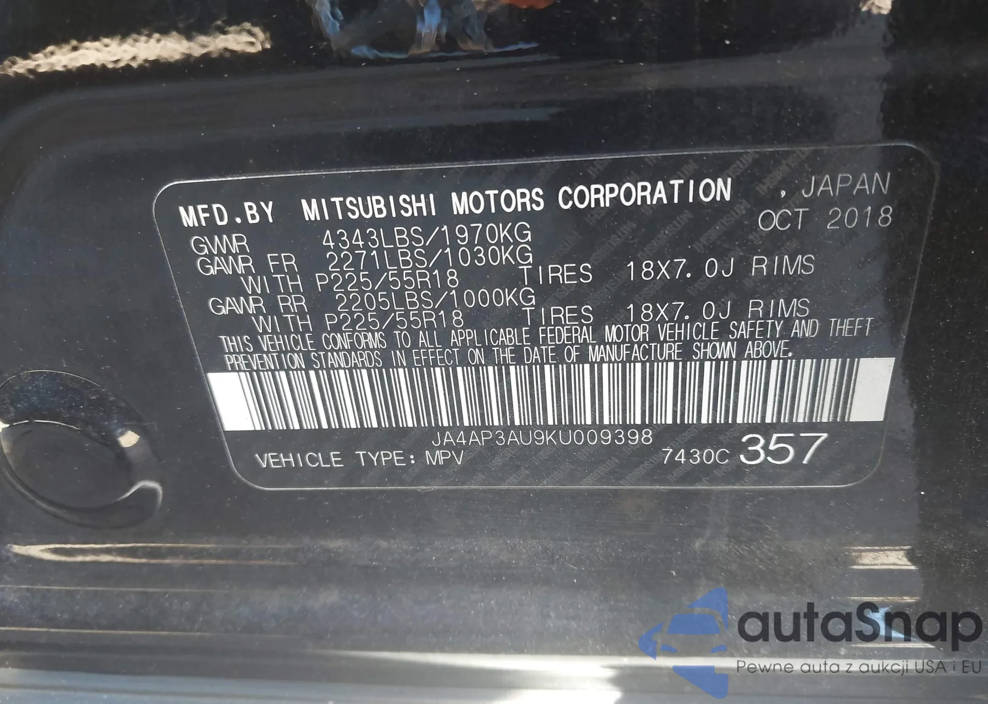 LOT: 43446447 VIN: JA4AP3AU9KU009398