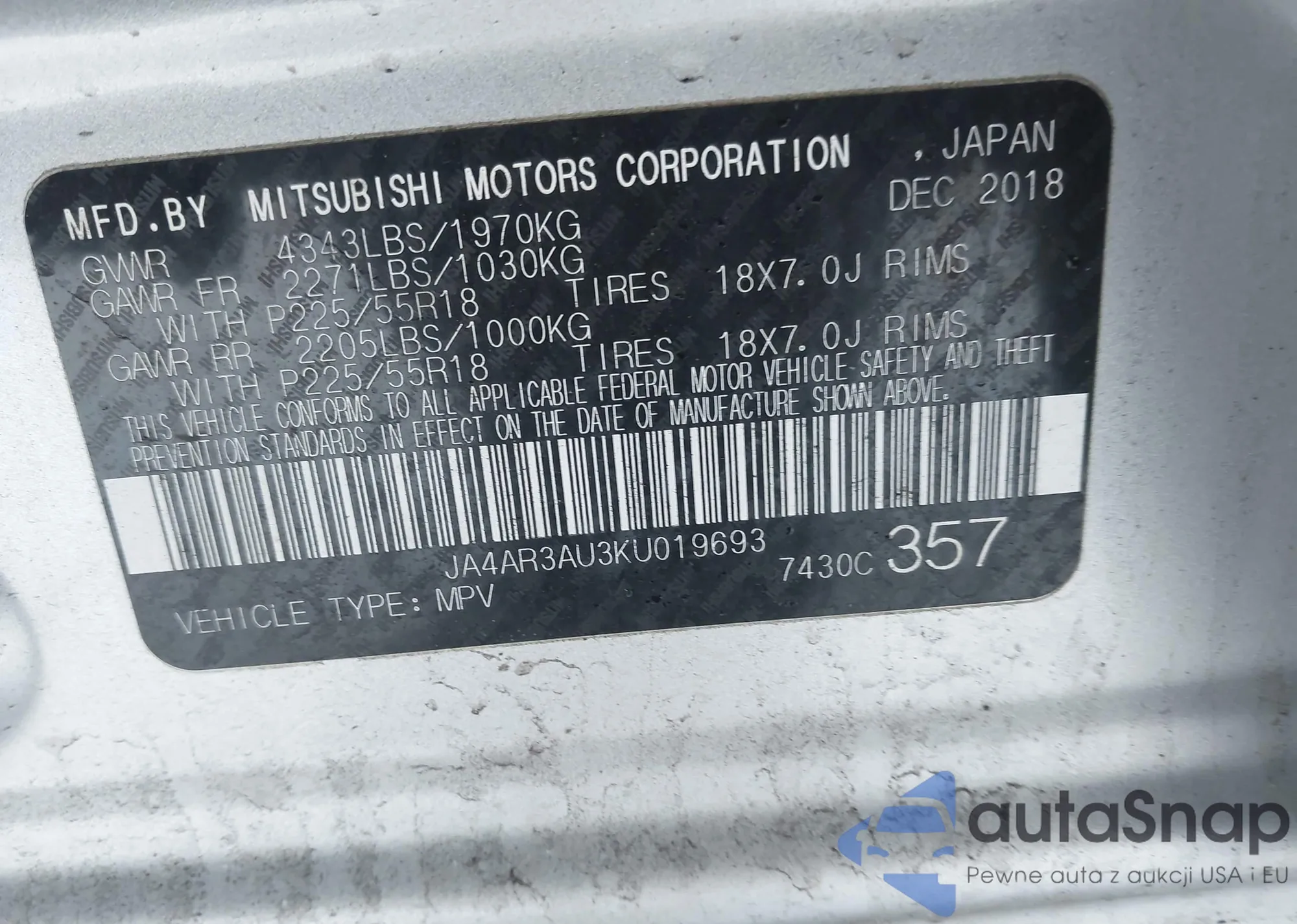 LOT: 44142542 VIN: JA4AR3AU3KU019693